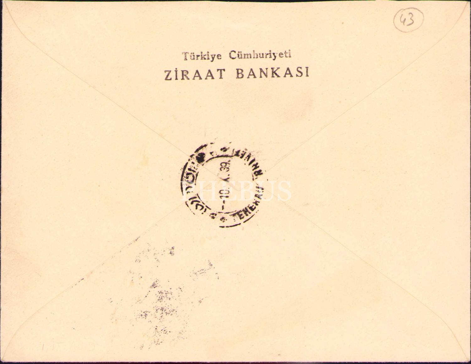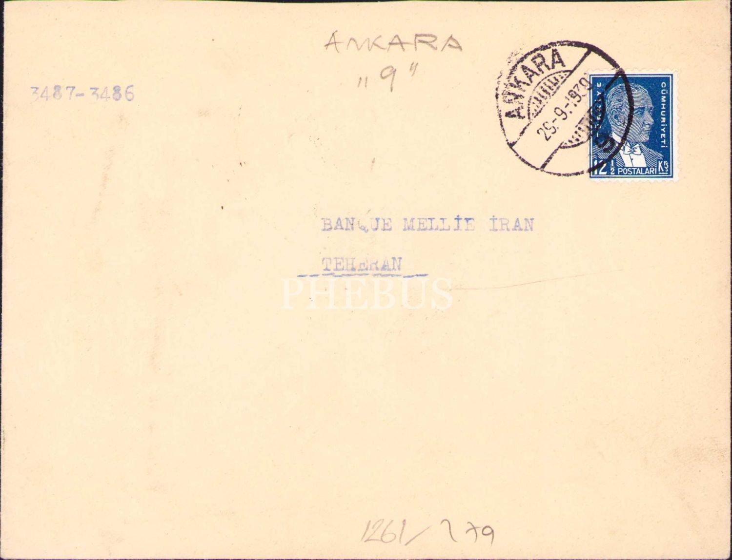 Türkiye Cümhuriyeti Ziraat Bankası antetli, Bank-ı Milli İran'a gönderilen zarf, pullu ve damgalı, 12x16 cm, üstten açılmış haliyle