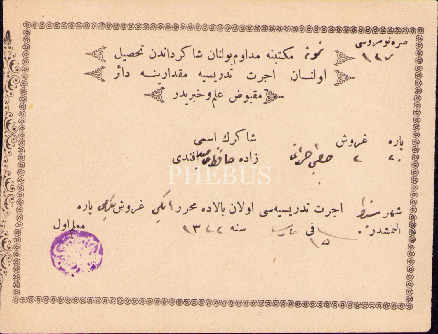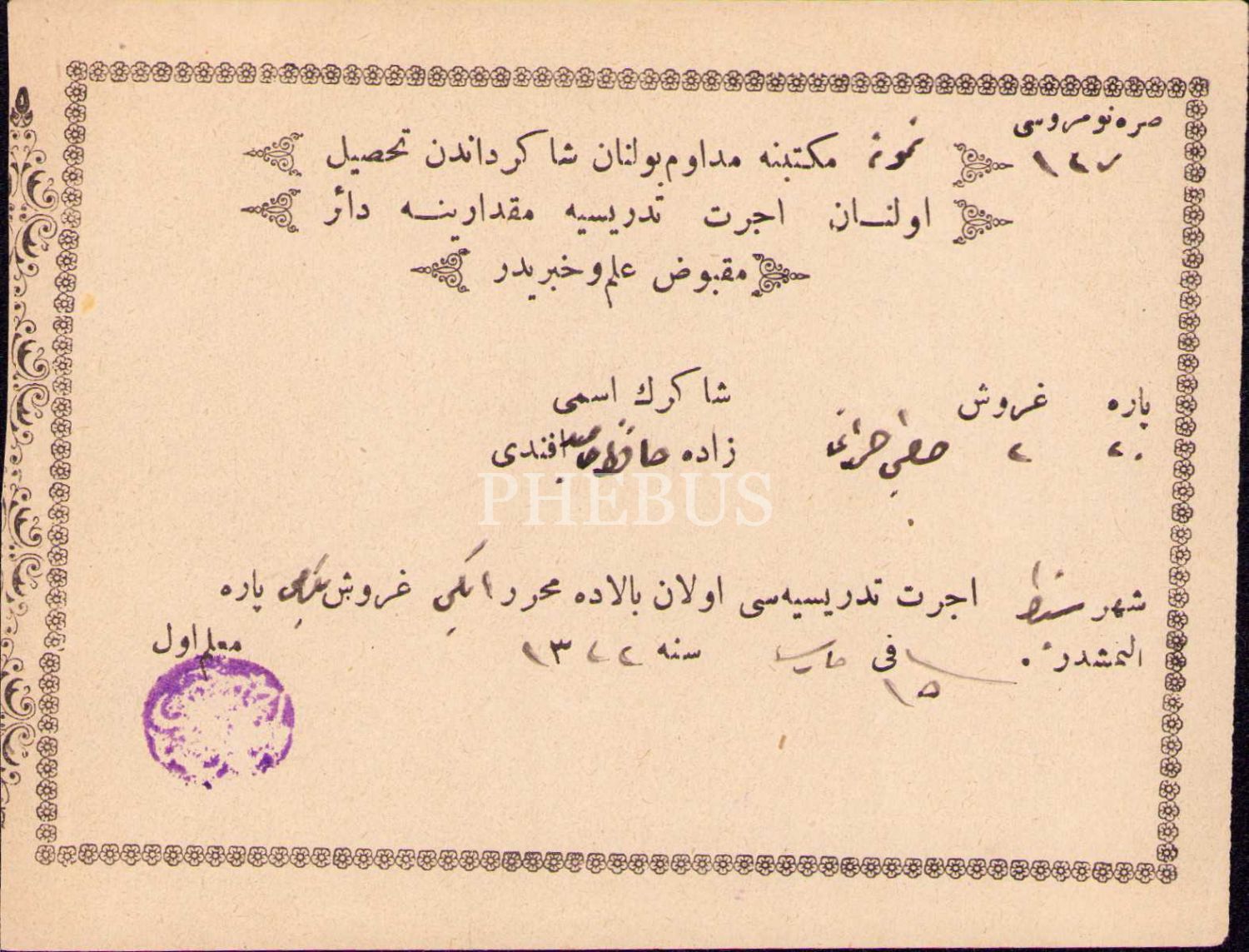 Osmanlıca okul aidat makbuzu, 1322 tarihli, 10x13 cm