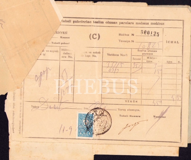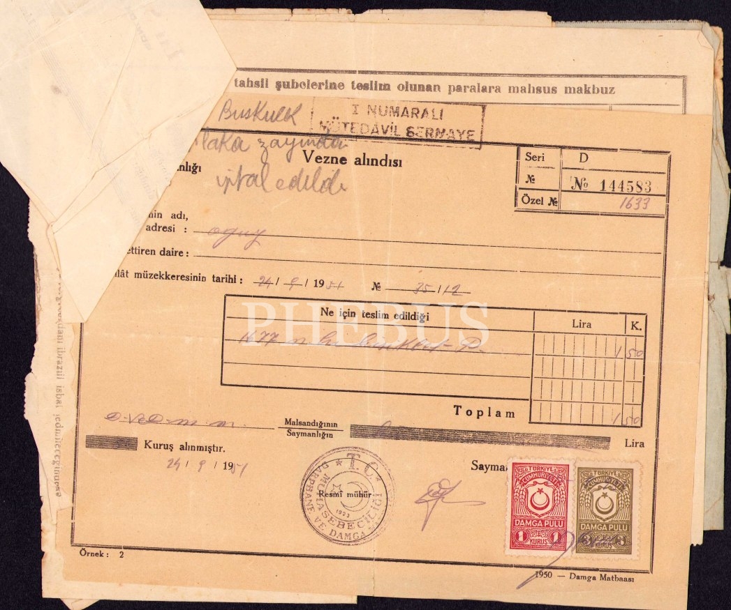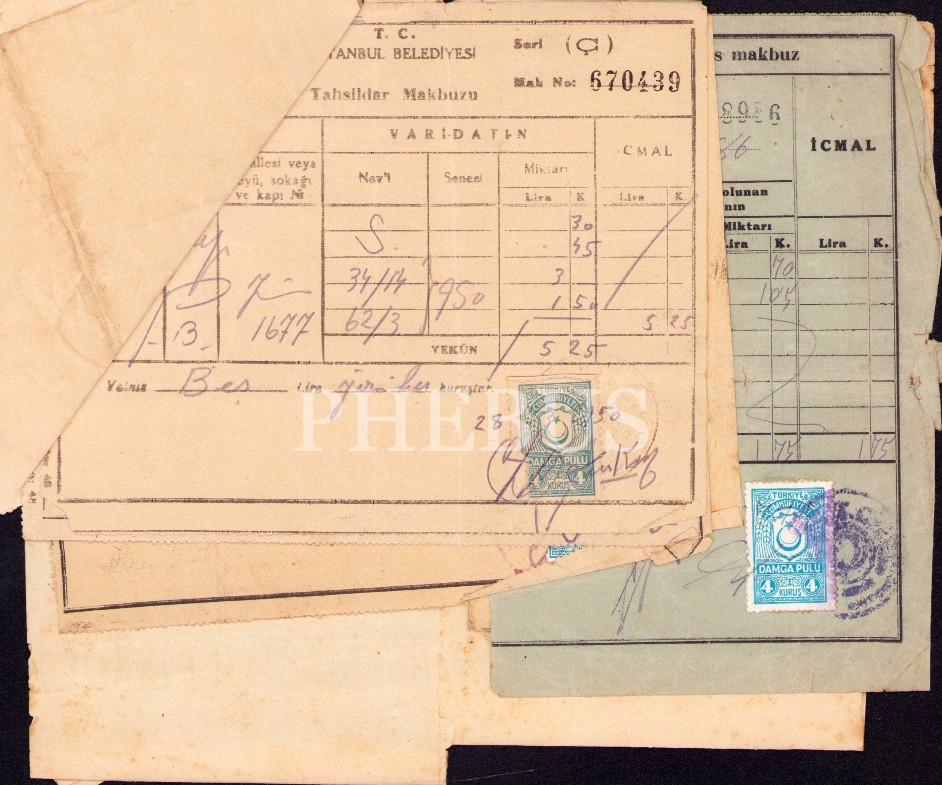 Çeşitli boyutlarda 10 adet makbuz, 1944-1951 yılları arasına ait, yıpranmış haliyle