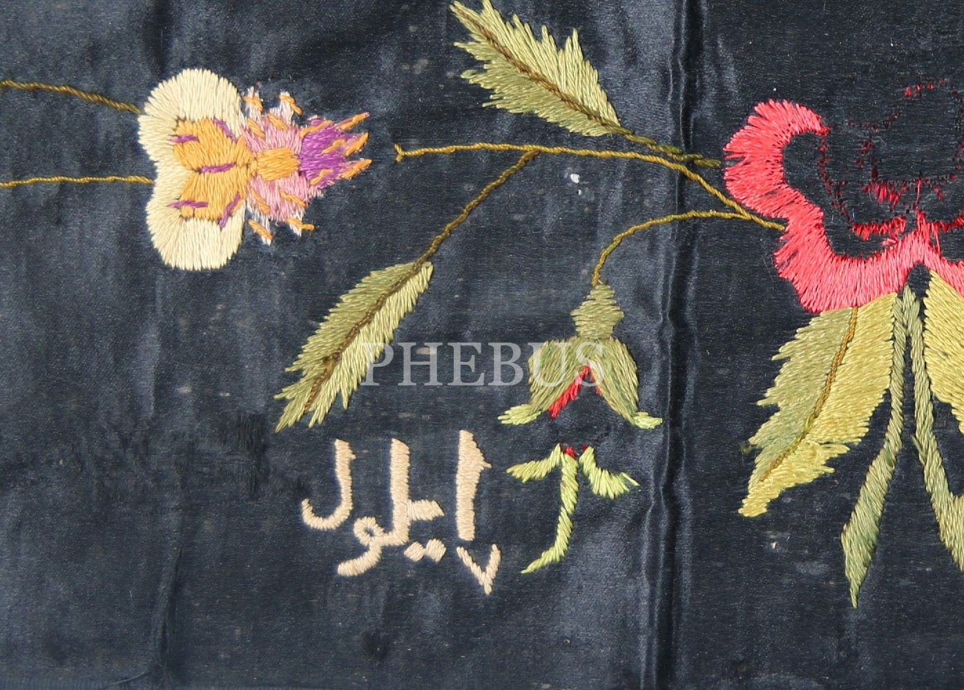 Sülüs Yazı İşlemeli Kumaş, "Zalimin zulmü var ise mazlumun Allah'ı var; Bunda cevr etmek kolay yarın Hakk'ın divanı var", 50x67 cm, kenarları yıpranmış haliyle
