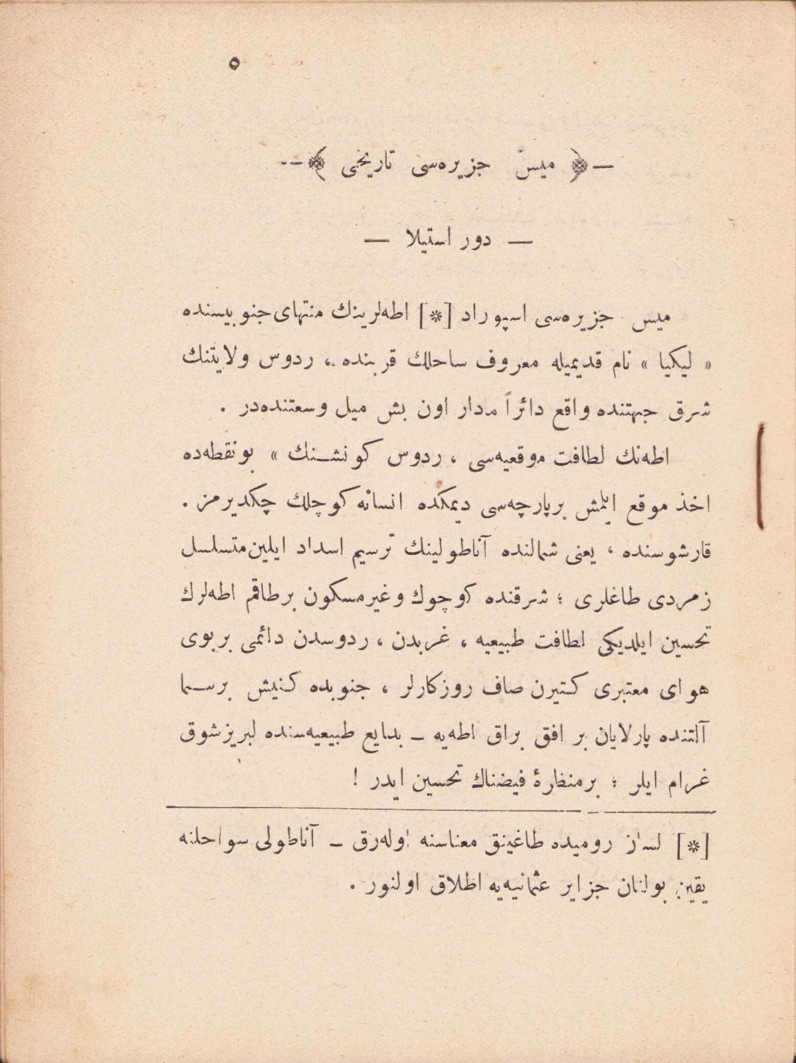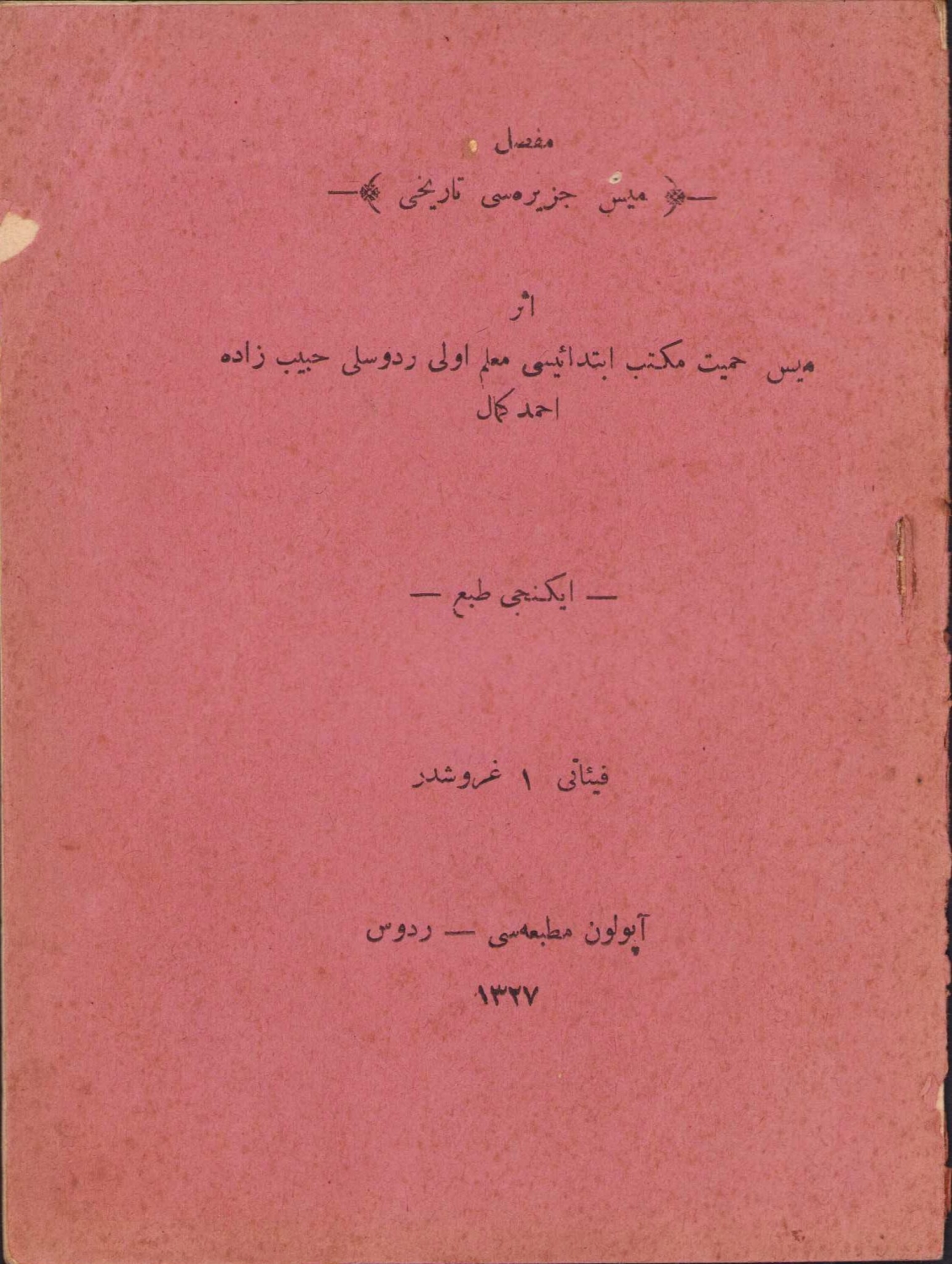 Mufassal Meis Ceziresi Tarihi, Rodoslu Habibzâde Ahmed Kemal, ikinci baskı, Apollon Matbaası, Rodos, 1327, Osmanlıca, 26 sayfa, 12x18cm, ÖZEGE; 13998