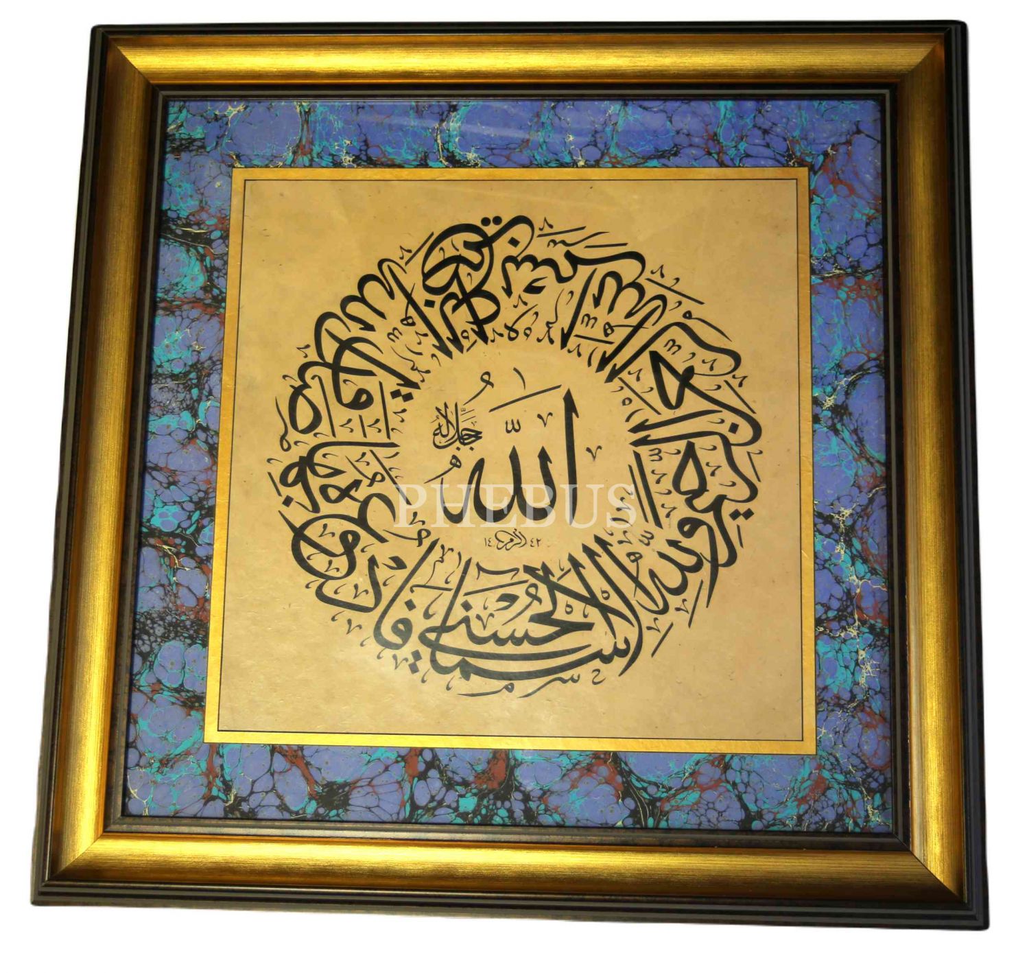 Celî Sülüs Ayet, "Ve lillahi'l-esmâi'l-hüsnâ fed'ûhu bihâ [En güzel isimler Allah'ındır; ona bu isimlerle dua edin]", Ekrem [Eşkin] ketebeli ve 1442 tarihli, ebrulu ve çerçeveli, yazı: 50x50 cm, çerçeve: 81x81 cm