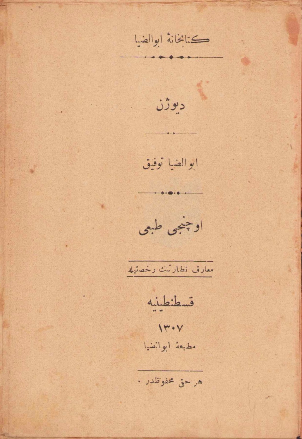 Diyojen, Ebuzziya Tevfik, üçüncü baskı, Matbaa-i Ebuzziya, ,Konstantiniye, 1307, Osmanlıca, cilt kopuk, 46 sayfa, 10x16cm, ÖZEGE; 7296
