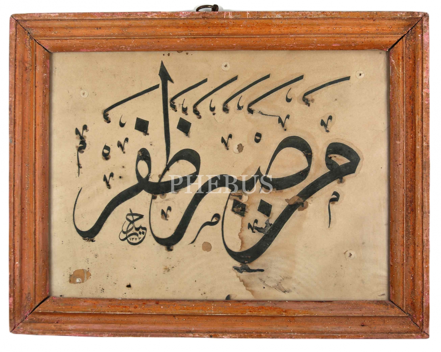 Celî Sülüs Yazı, "Men sabera zafera [Sabreden kazanır]", Haydar ketebeli ve 1323 tarihli, yazı: 24x33 cm, çerçeve: 31x41 cm