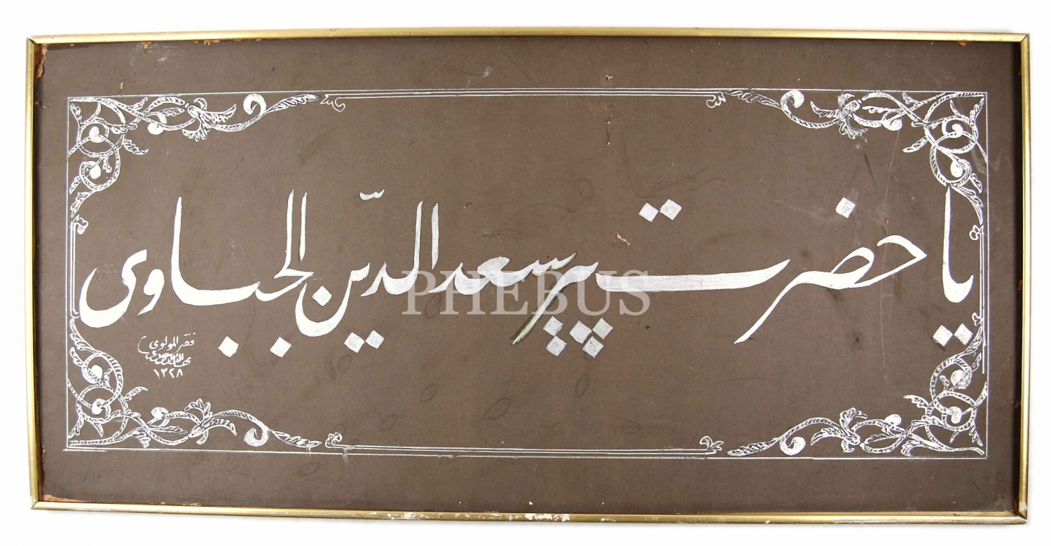 Sa’diye Tarikatı Piri İçin Yazılmış Levha, "Ya Hezret-i Pir Sadeddin el-Cebavî", Bahaeddin Hurî Mevlevî ketebeli ve 1328 tarihli, 31x65 cm, yıpranmış haliyle