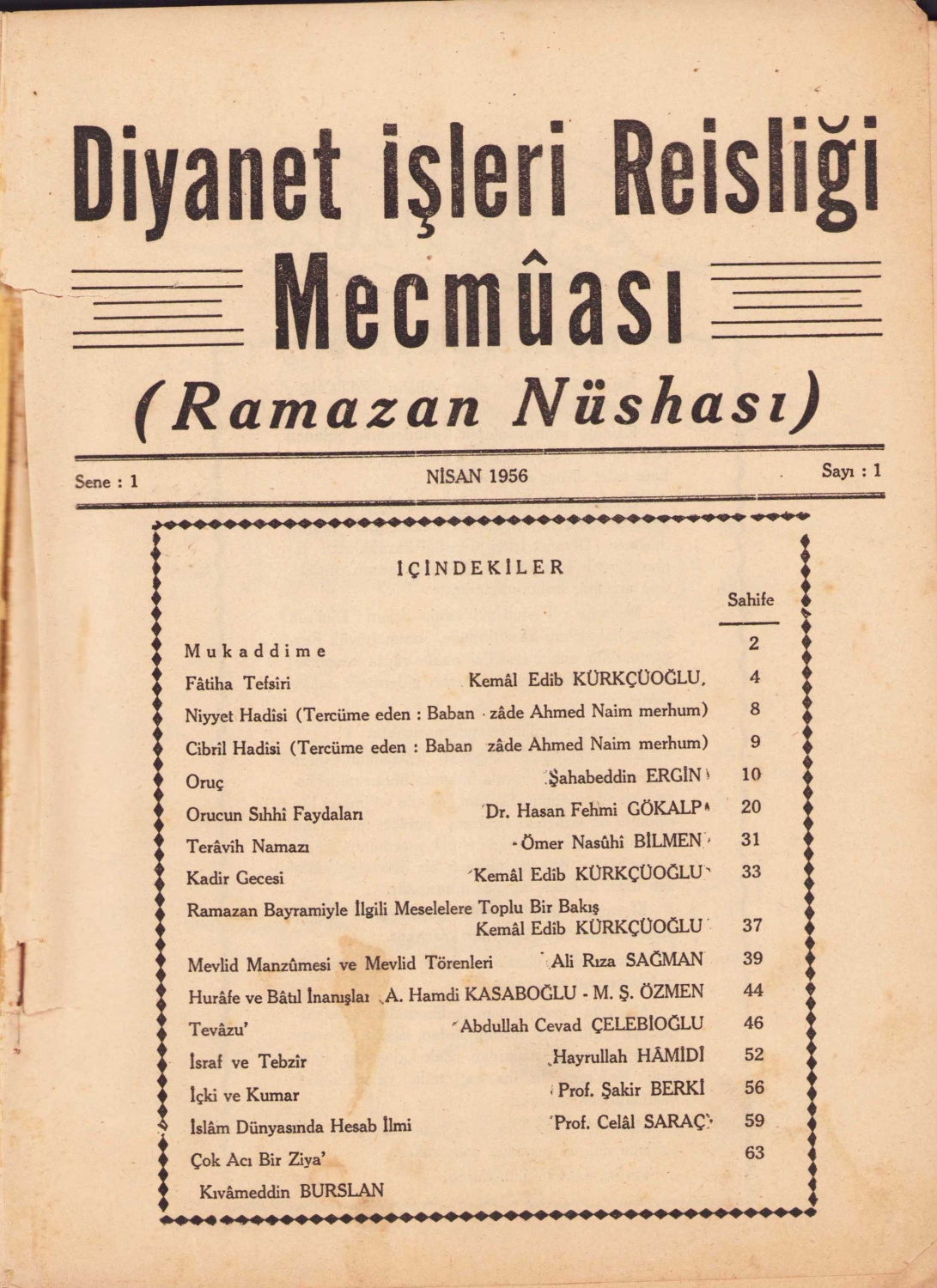 Diyanet İşleri Reisliği Mecmuası - Ramazan Nüshası 1, Ankara, 1956, ön kapak kırık, 64 sayfa, 20x27cm