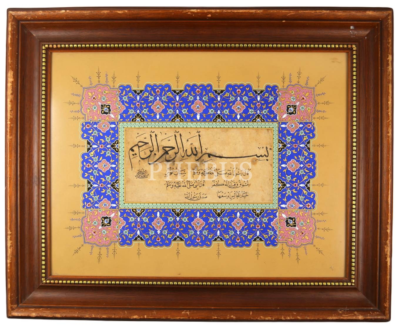 Sülüs-Nesih Kıta, Besmele ve Hadîs-i Şerîf, Abdurrahman Hilmi Efendi ketebeli, tezhipli, yazı: 12x22 cm, çerçeve: 61x50 cm