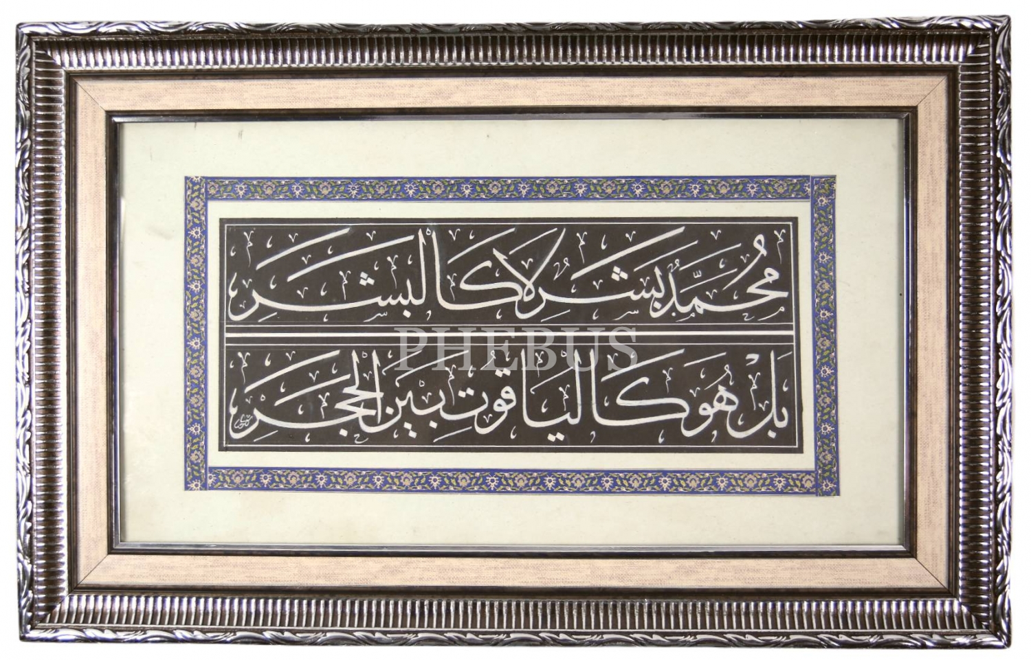 Celî Sülüs Yazı, "Muhammed beşerdir ama her beşer gibi değil, taşlar arasında yakut mesabesindedir", Mehmed Şevket Pektaş ketebeli, sadece yazı: 34x14 cm, çerçeve: 59x37 cm