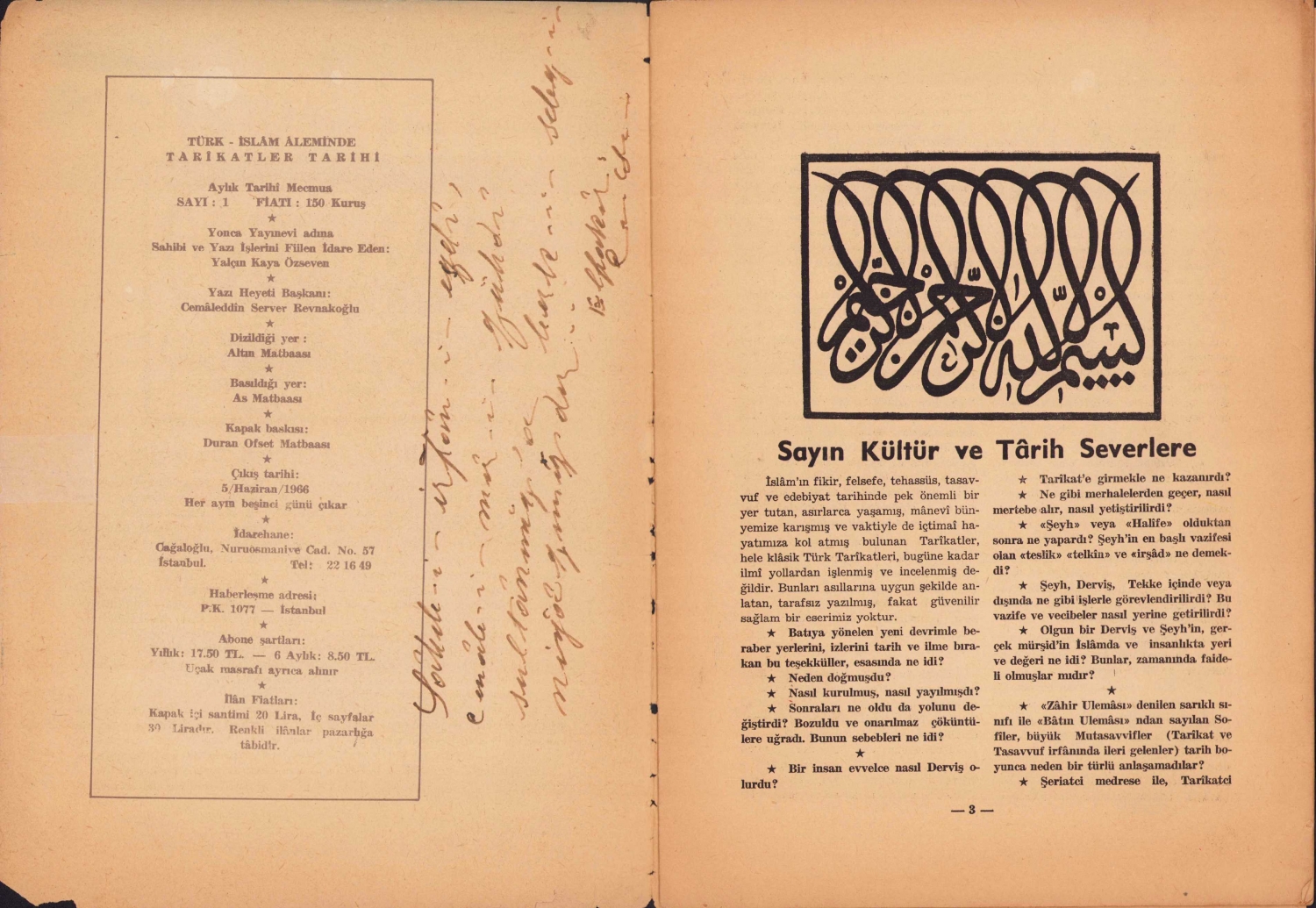 Türk - İslam Aleminde Tarikatler Tarihi, SAYI 1, Cemaleddin Server Revnakoğlu, ithaflı imzalı, görselli, 18 sayfa, 20x27cm