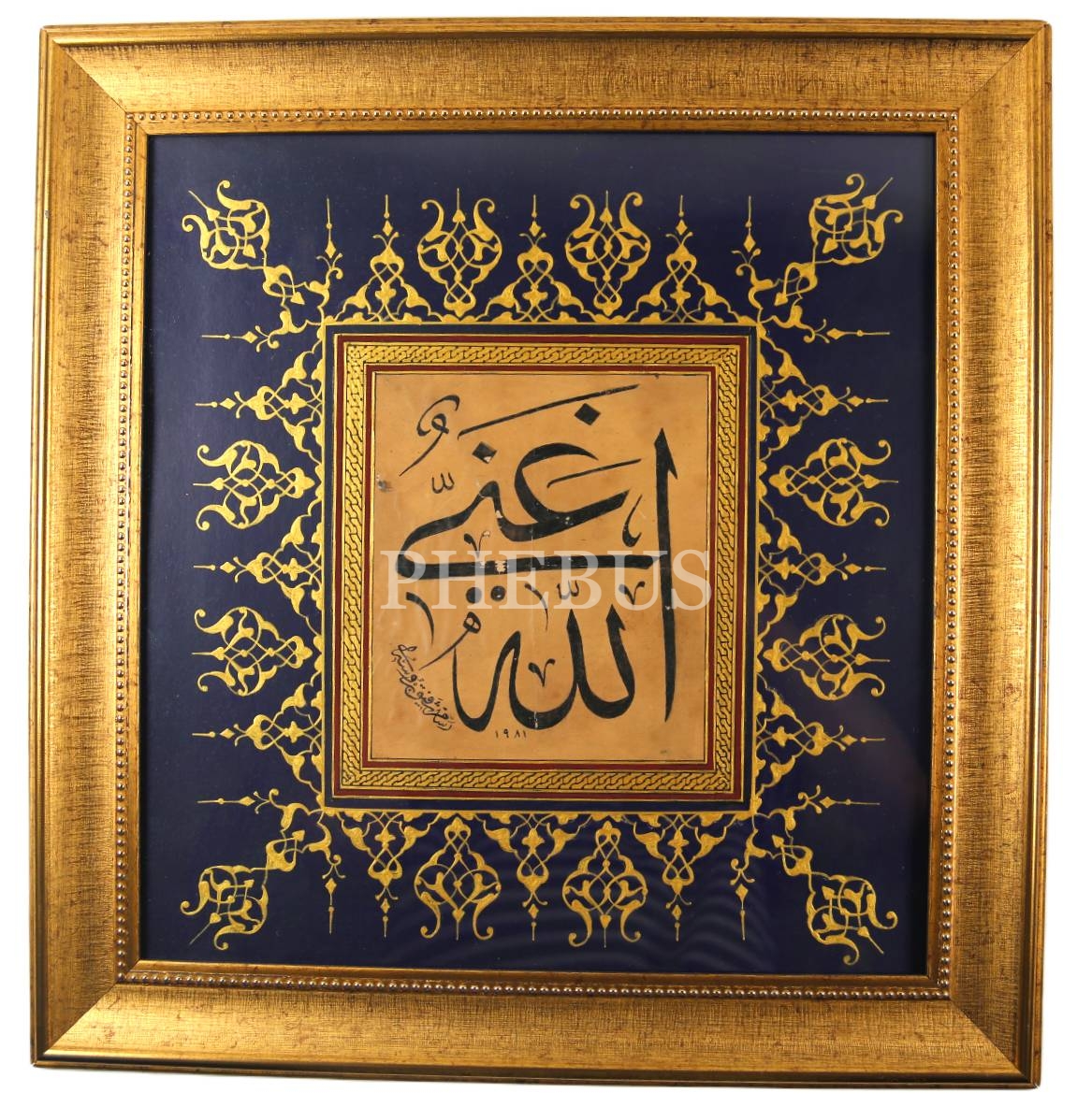 Celî Sülüs Yazı, "Allâhu Ganiyyun", Ressam Şefik Burusevî [Şefik Bursalı], 1981 tarihli, tezhipli, yazı: 15x17 cm, çerçeve: 42x44 cm