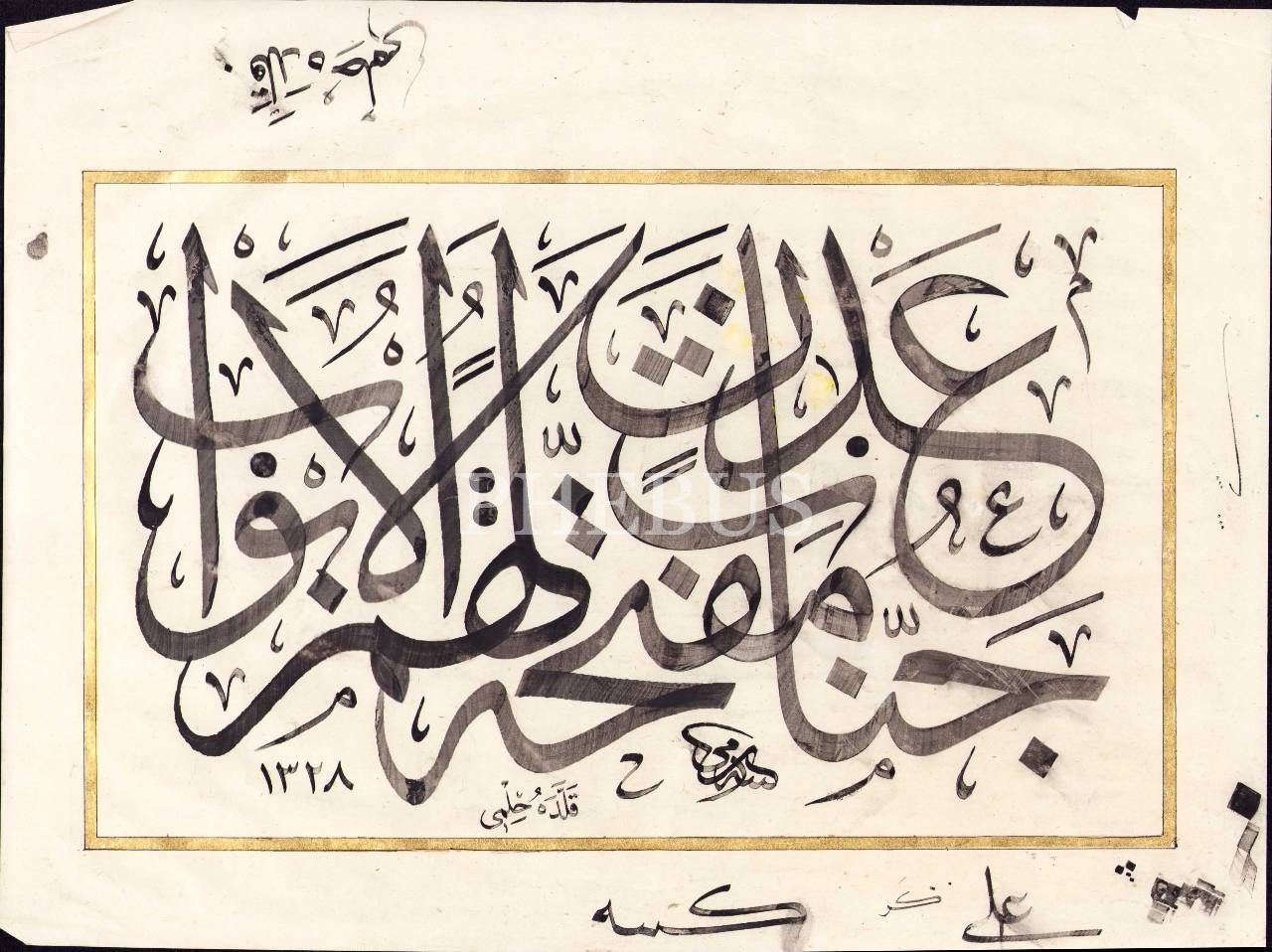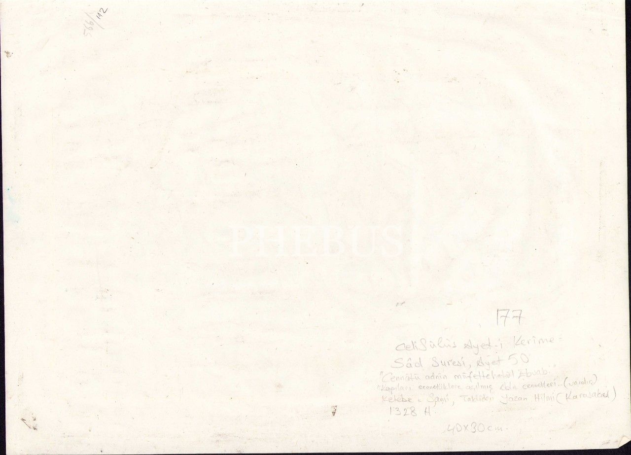 Celî Sülüs Ayet, "Cennâti Adnin müfettahaten lehümü'l-ebvâb [Onlara kapıları kendilerine ardına kadar açılacak Adn cennetleri vardır]", Sami ketebeli ve 1328 tarihli, altın cetvelli, 30x39 cm