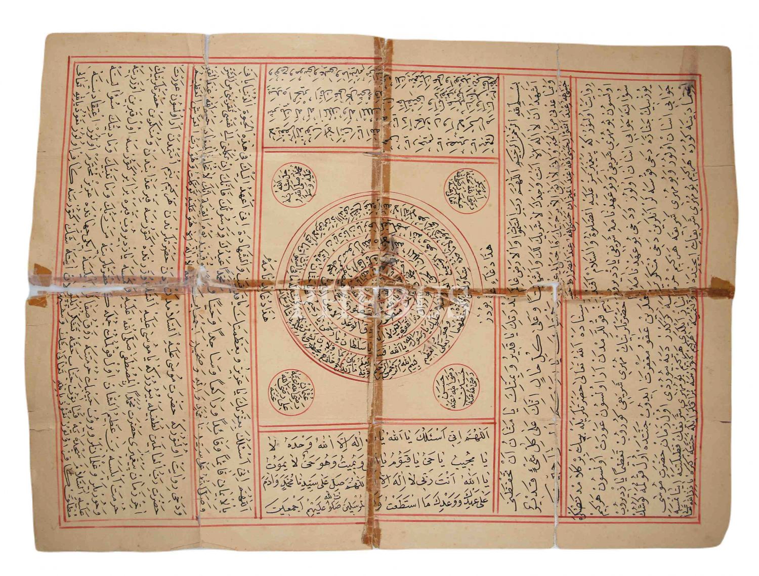 Arapça-Osmanlıca Ahidnâme ve Kefen Duası [Mühr-i Şerif] ile Fazileti, 35x47 cm, parçalanmış ve yıpranmış haliyle