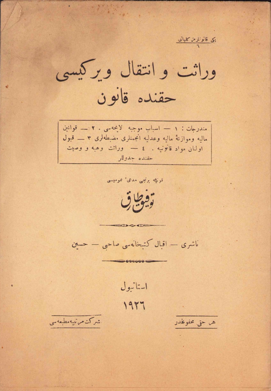 Veraset ve İntikal Vergisi Hakkında Kanun, Tevfik Tarık, Neşri Yeni Kanunlarımız Külliyatı: 6, Şirketi Mürettibiye Matbaası, İstanbul