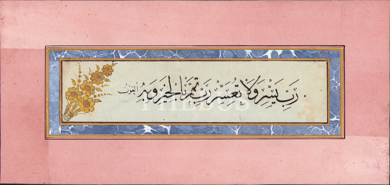 Sülüs Yazı, "Rabbim kolaylaştır, zorlaştırma, hayırla tamamına erdir", altın cetvelli ve ebrulu, 5x23 cm