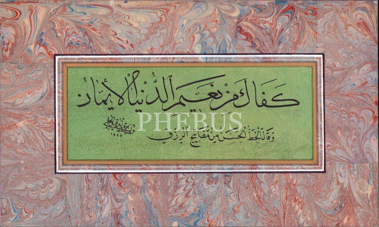 Sülüs-Nesih Yazı, "Kefâke min naîmi'd-dünyâ el-îmân [Dünya nimeti olarak iman sana yeter]", es-Seyyid Muhammed Tevfik el-Hilmi ketebeli ve 1282 tarihli, altın cetvelli ve ebrulu, 8x21 cm