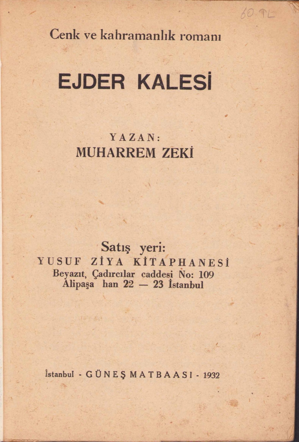 Ejder Kalesi, Muharrem Zeki, İstanbul, 1932, arka kapak yıpranmış, 63 sayfa, 14x20cm