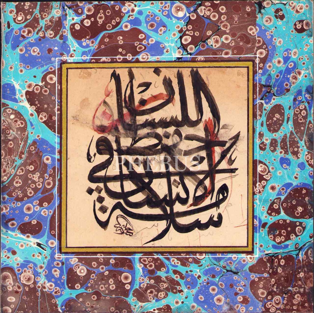 Hattat Halim Ketebeli Sülüs İstifi Yazı Taslağı, "Selâmetü'l-insân fî hıfzı'l-lisan [İnsanın selameti dilini korumasındadır]", altın cetvelli ve ebrulu, 13x13 cm
