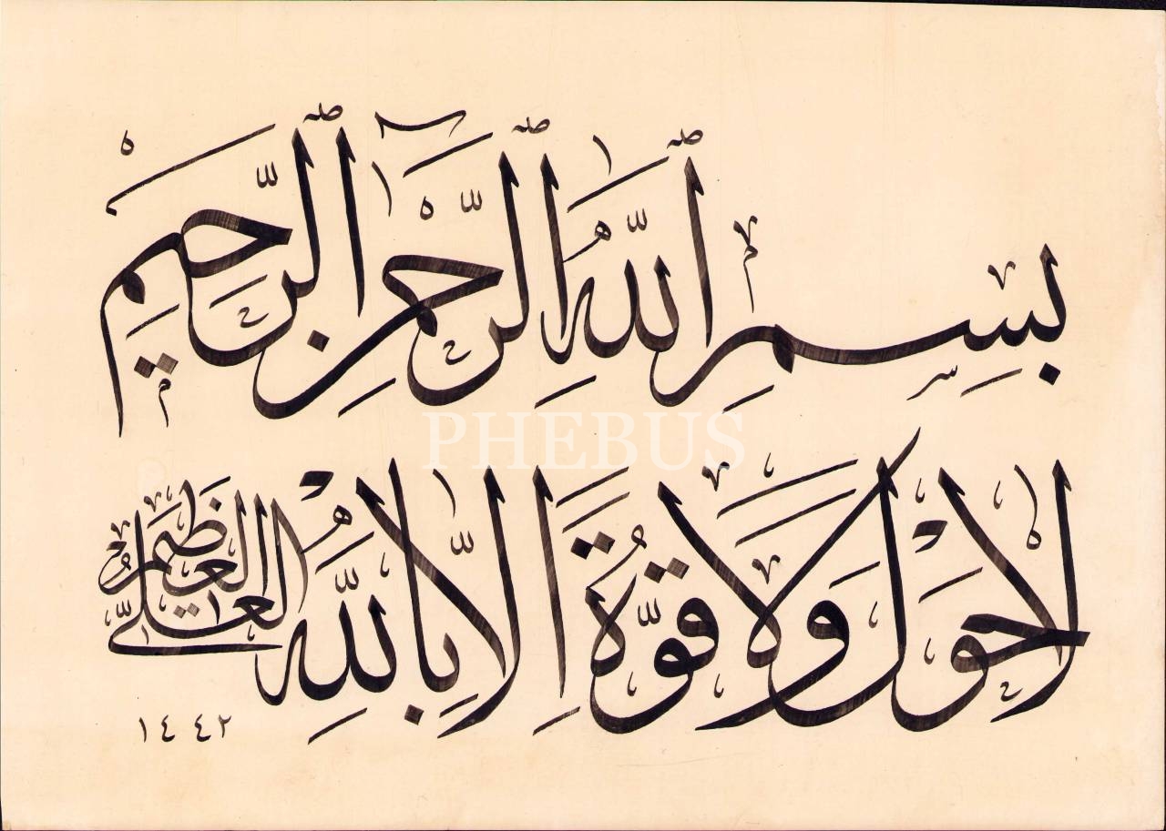 Sülüs Yazı, Besmele ve "La havle ve lâ kuvvete illâ billâhi'l-Aliyyi'l-Azîm [Güç ve kuvvet yalnızca yüce Allah'ın yardımıyladır]", 1442 tarihli, 30x20 cm