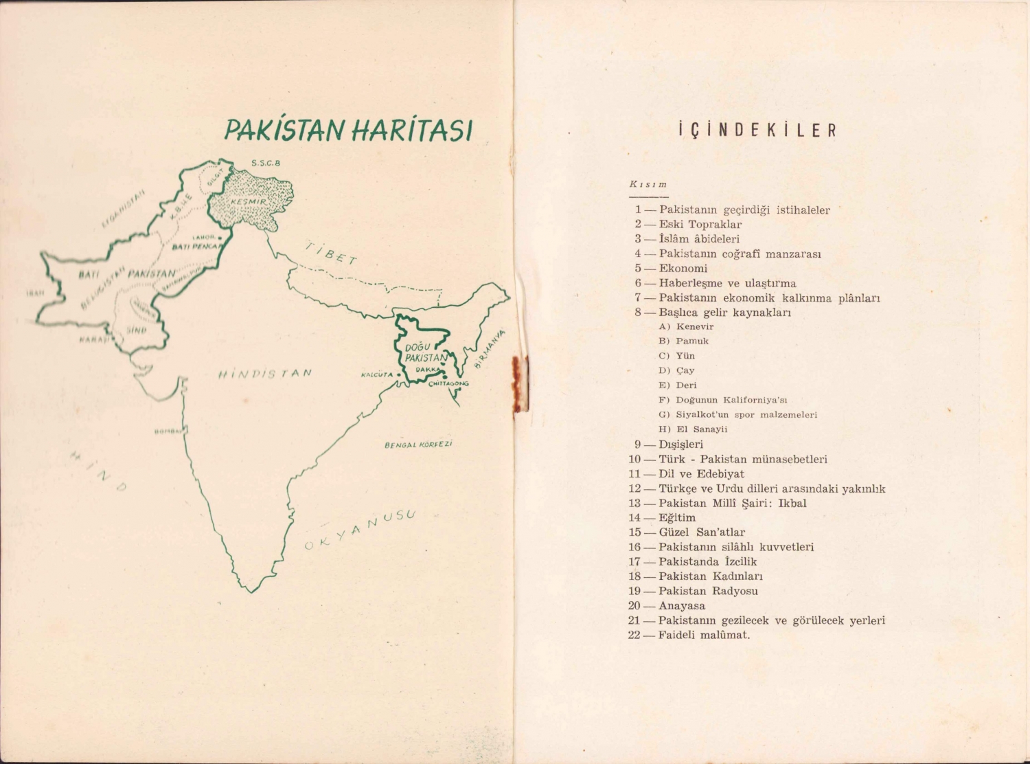 Pakistan, Pakistan Sefareti Basın Ataşeliği tarafından hazırlanmıştır. İstanbul, 1950, kapak türk bayrağı temalı haz., Şalimar Bağçeli, bol görselli, Pakistan haritası detaylı, 55 sayfa, 16x24cm