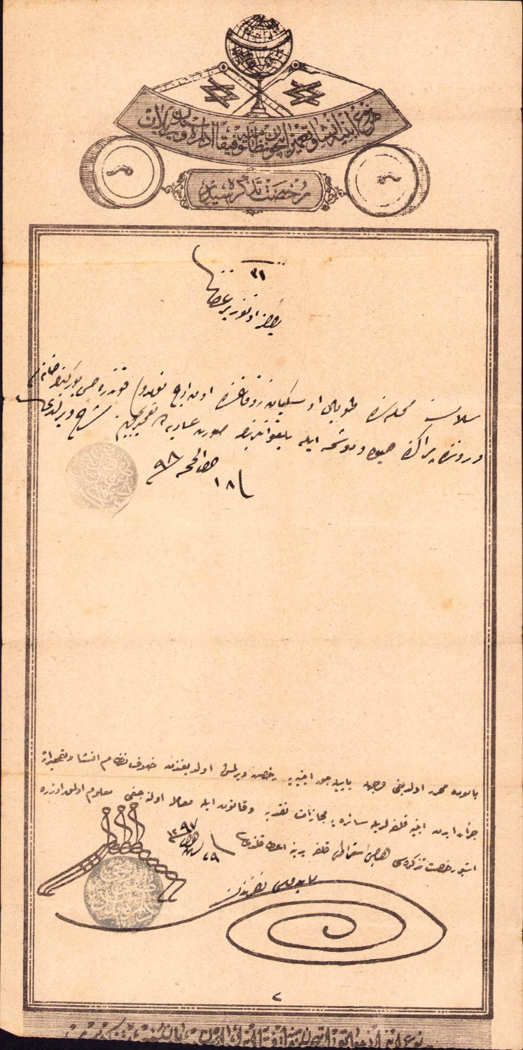 Beyoğlu Selamsızdaki binalara ait Osmanlı ruhsat tezkeresi, 1297 tarihli, 16x32cm
