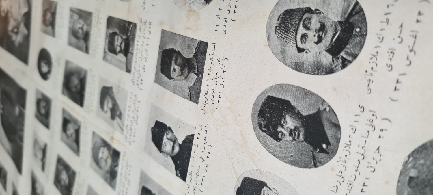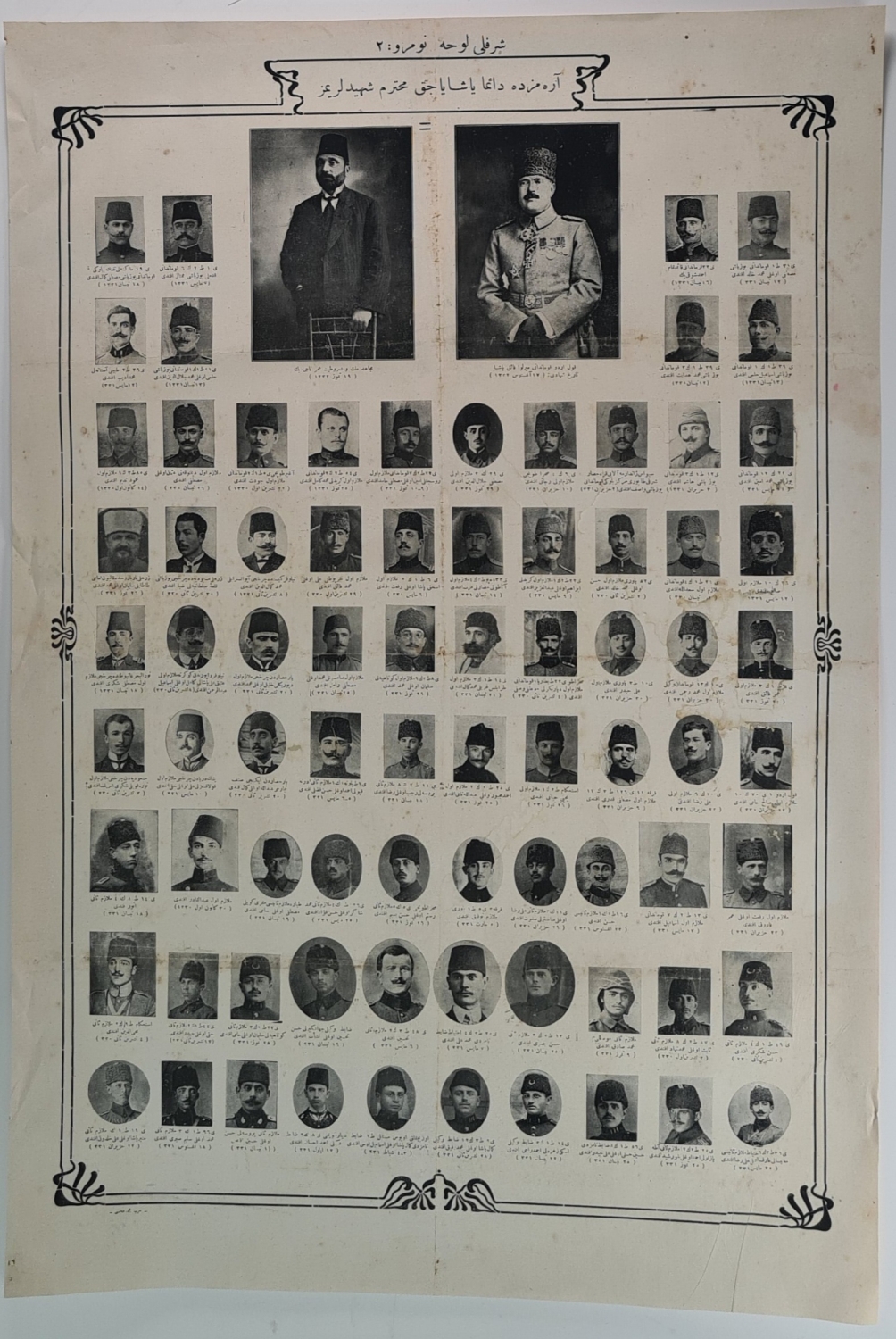 Birinci Dünya Savaşı'nda şehit düşen askerlerimizin fotoğraflarının olduğu Şerefli Osmanlıca levha, 52x76 cm