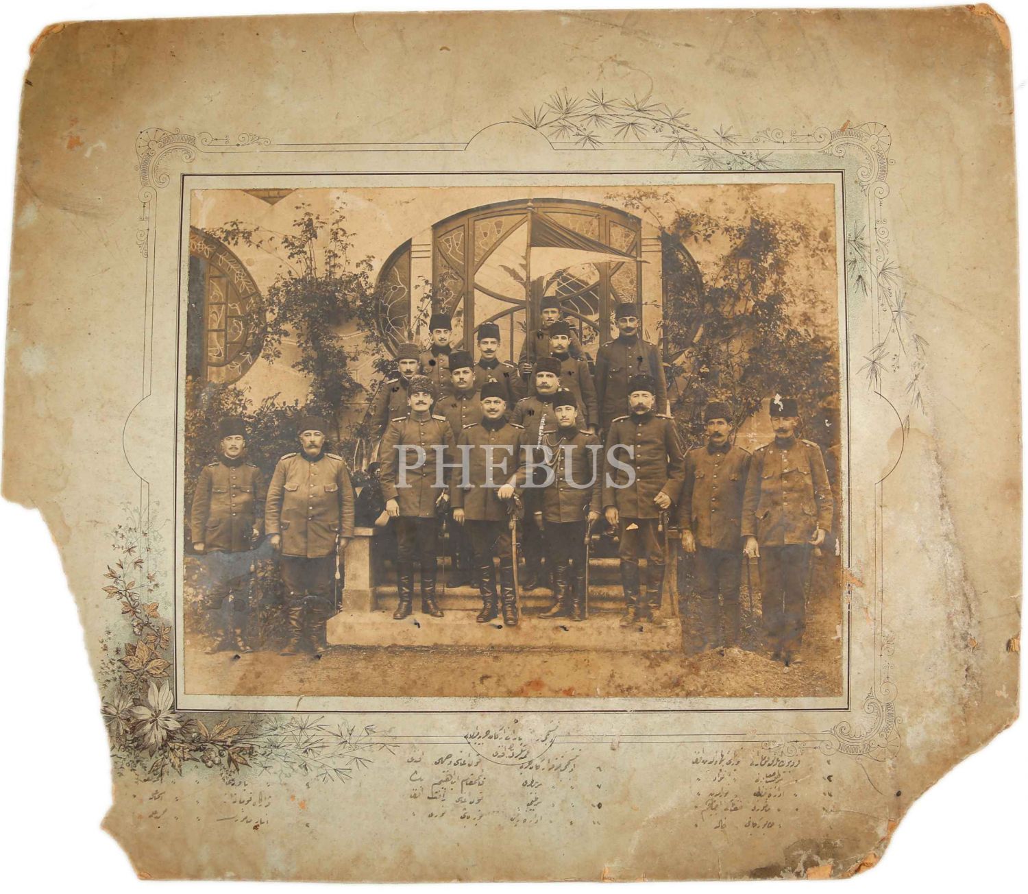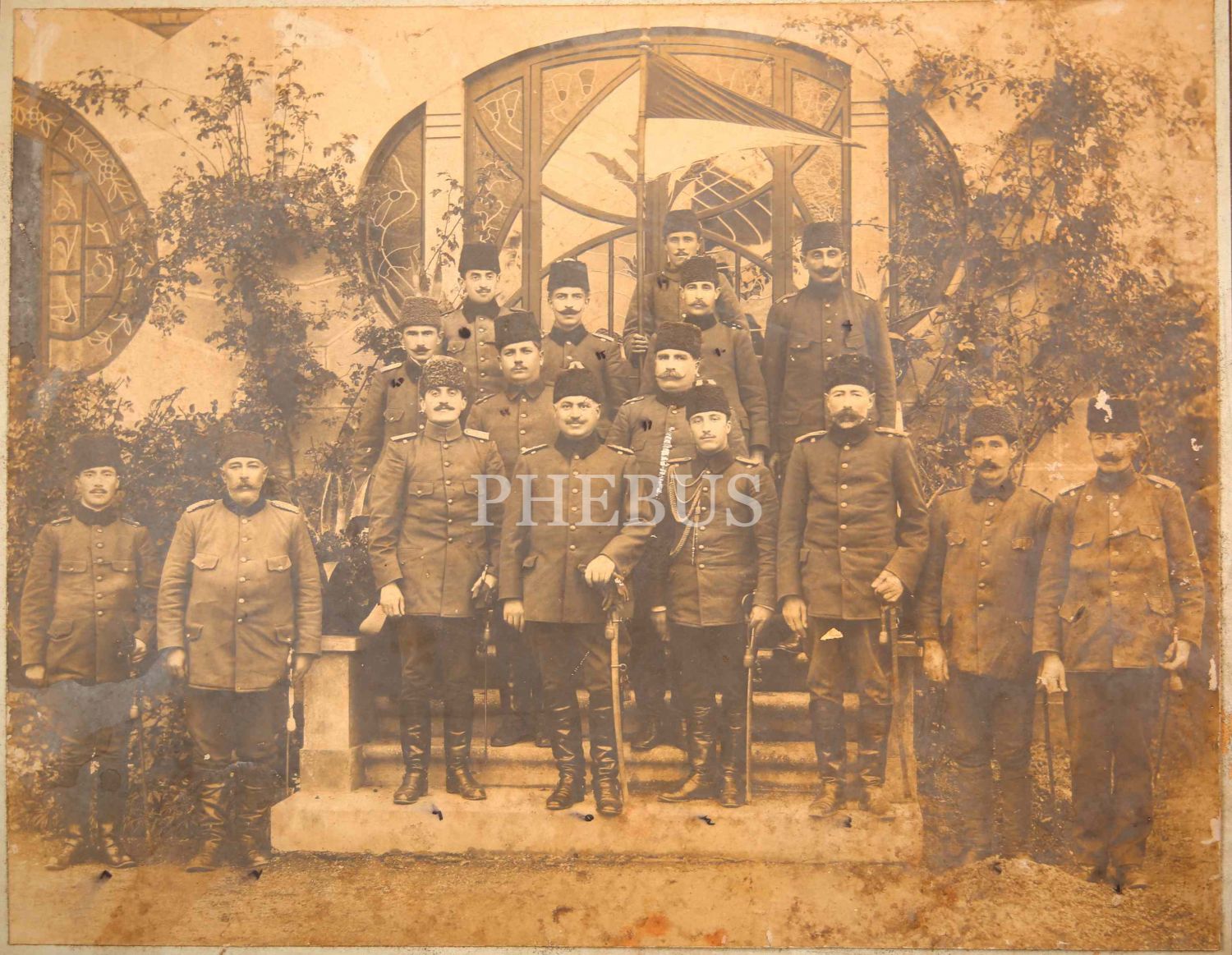 Balkan ve Birinci Cihan Harbi'nde Görev Alan Çanakkale 15. Tümen Kumandanı Mehmed Şükrü [Sagun] Paşa, Osmanlı Subayları ile Hâtıra Fotoğrafı, Osmanlıca izahlı, büyük boy, haliyle, 30x23 cm