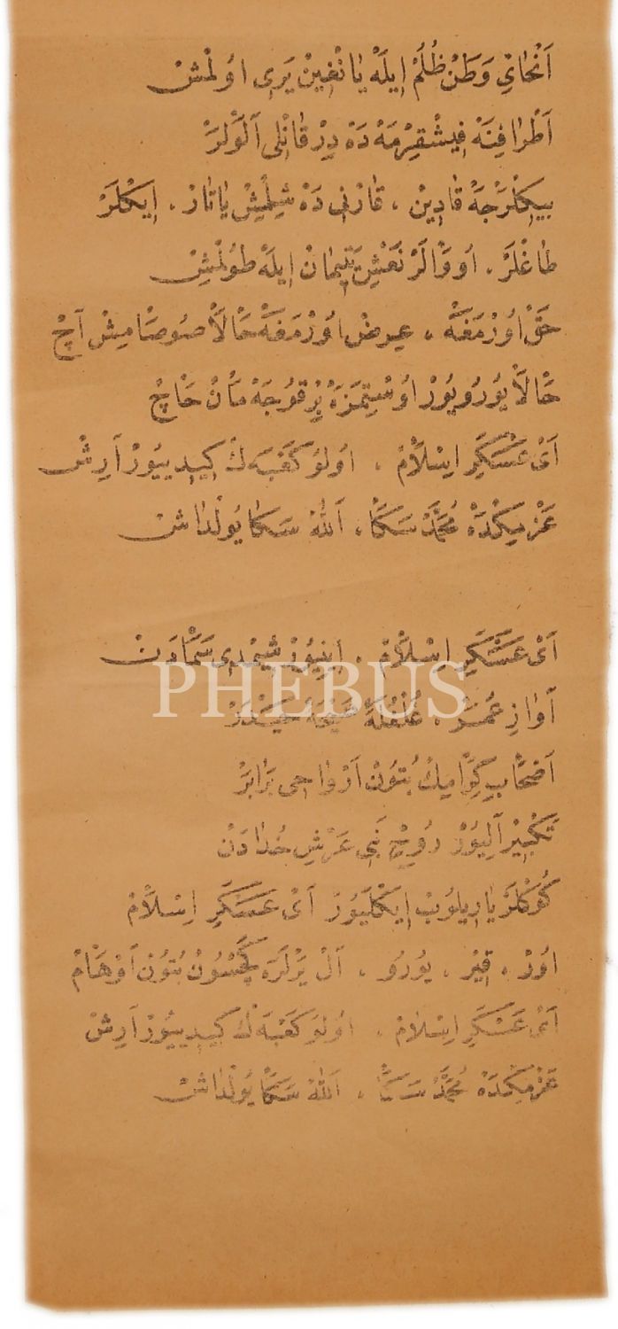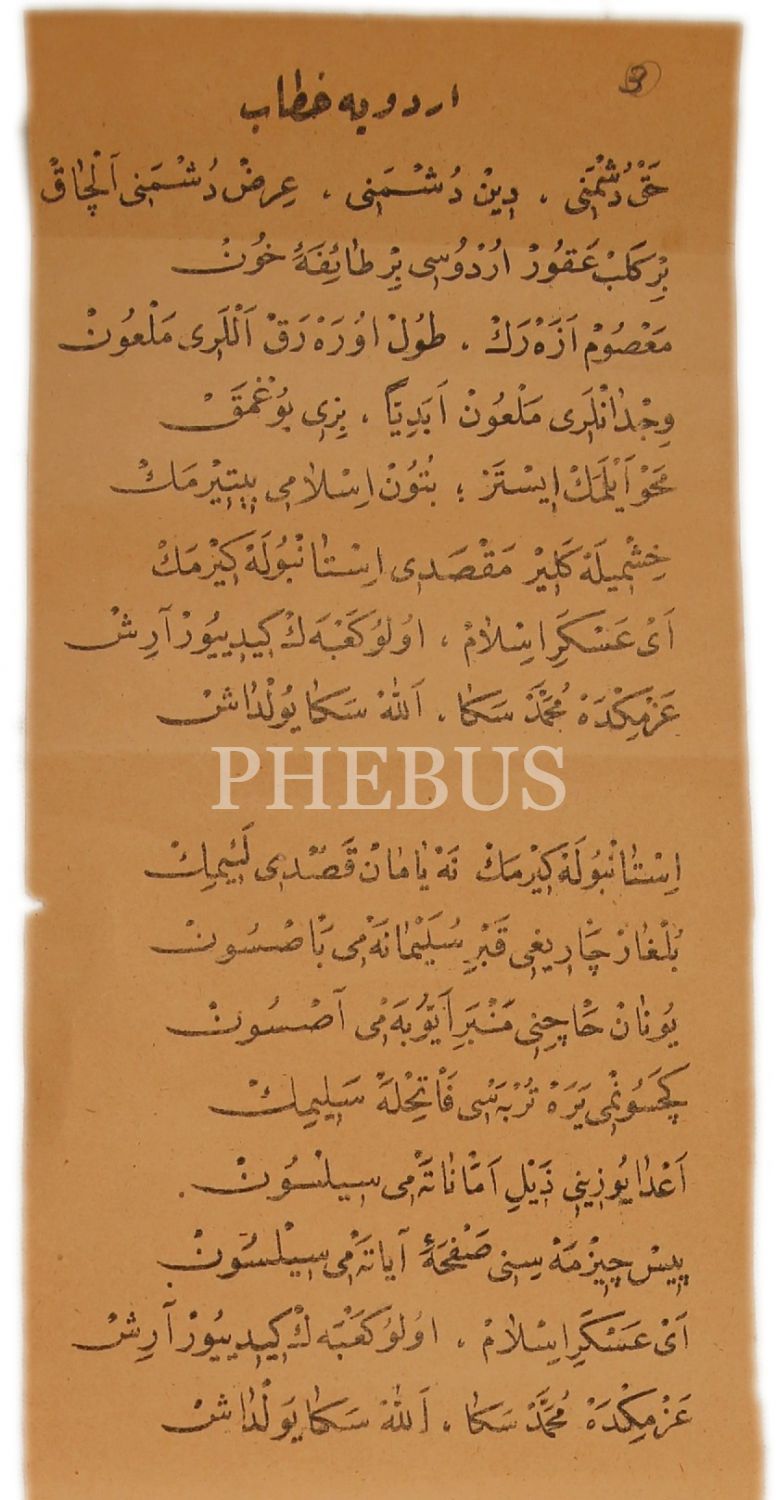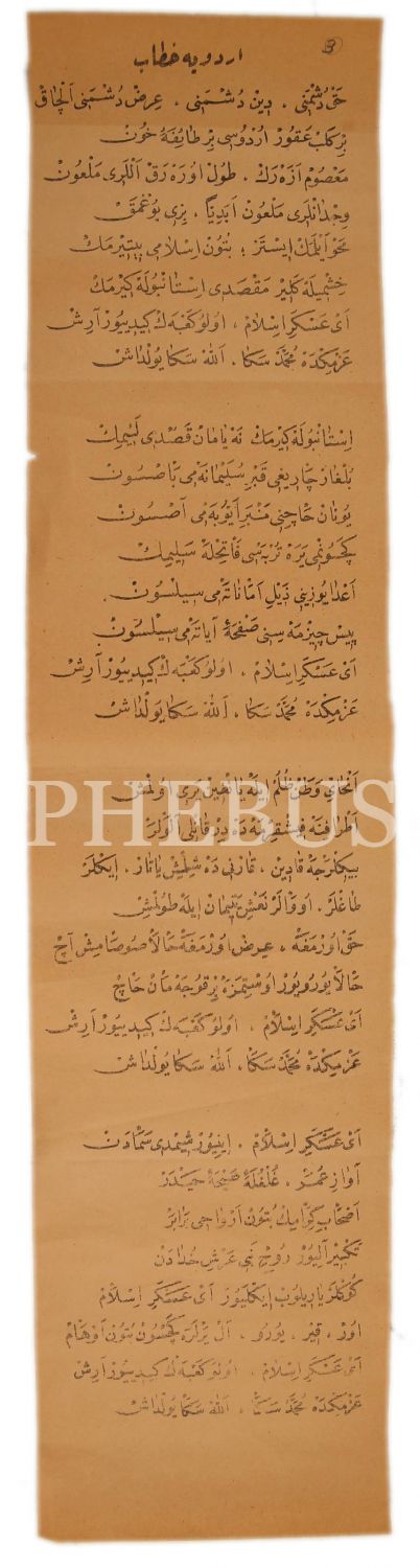 Osmanlıca "Orduya Hitab" Başlıklı Destan, "Hak Düşmanı, Din Düşmanı, Irz Düşmanı Alçak Bir Kelb-i Akur Ordusu Taife-i Hun", 13x57 cm