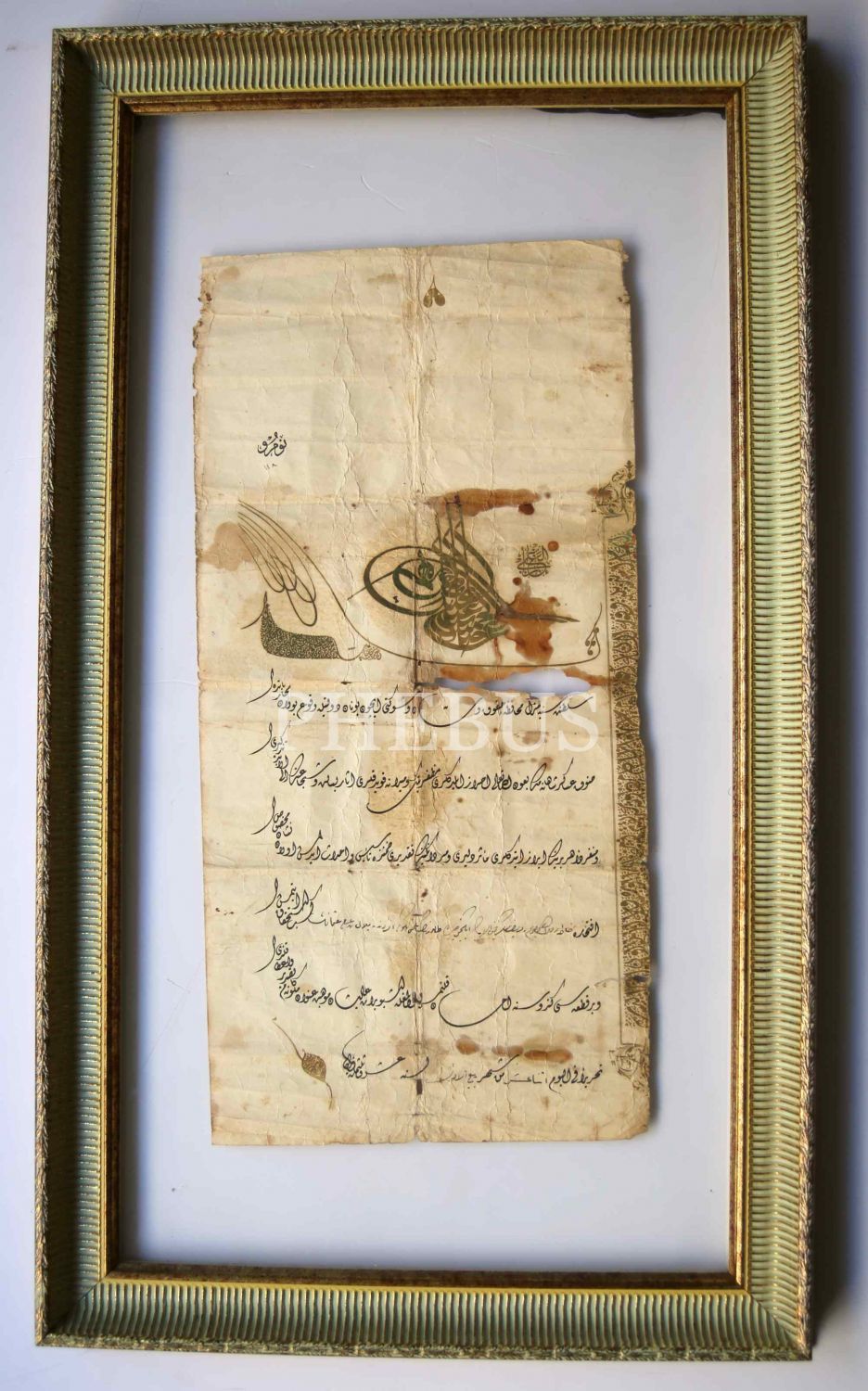 Beratın çerçevesi 27x56 cm, çerçeve: 49x83 cm, belge yıpranmış haliyle, madalya 2,5 cm