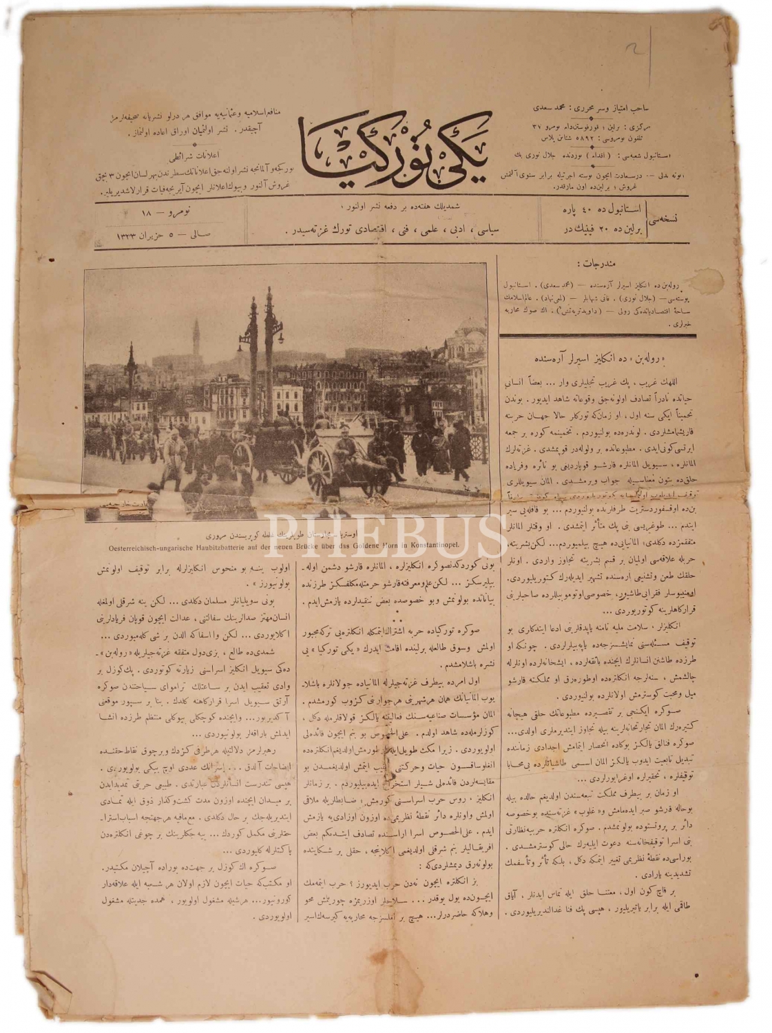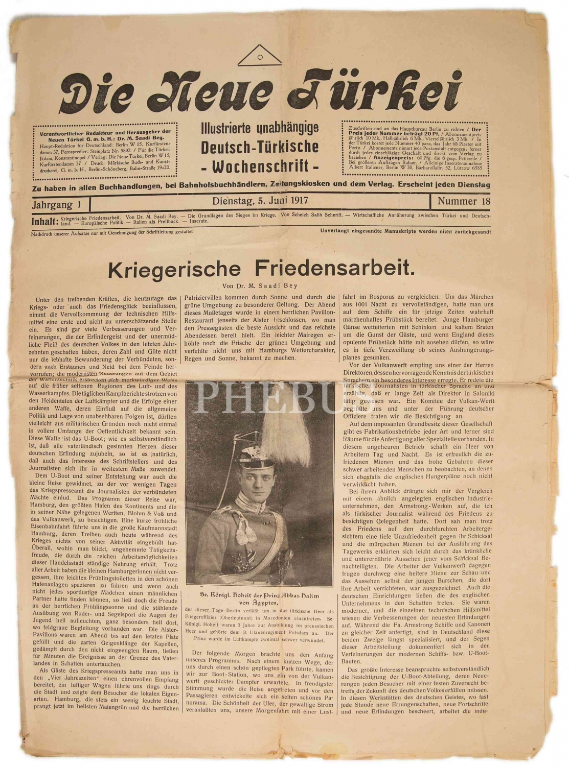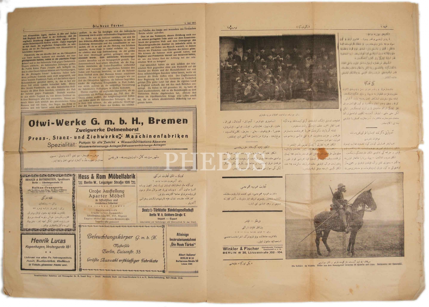 Birinci Cihan Harbi'nde Almanya'da Yayınlanmış Almanca ve Türkçe Harp Dergisi: Yeni Türkiye, 5 Haziran 1333 târihli, Ser Muharriri: Mehmed Sadi, 12 sayfa, haliyle, 32x46 cm