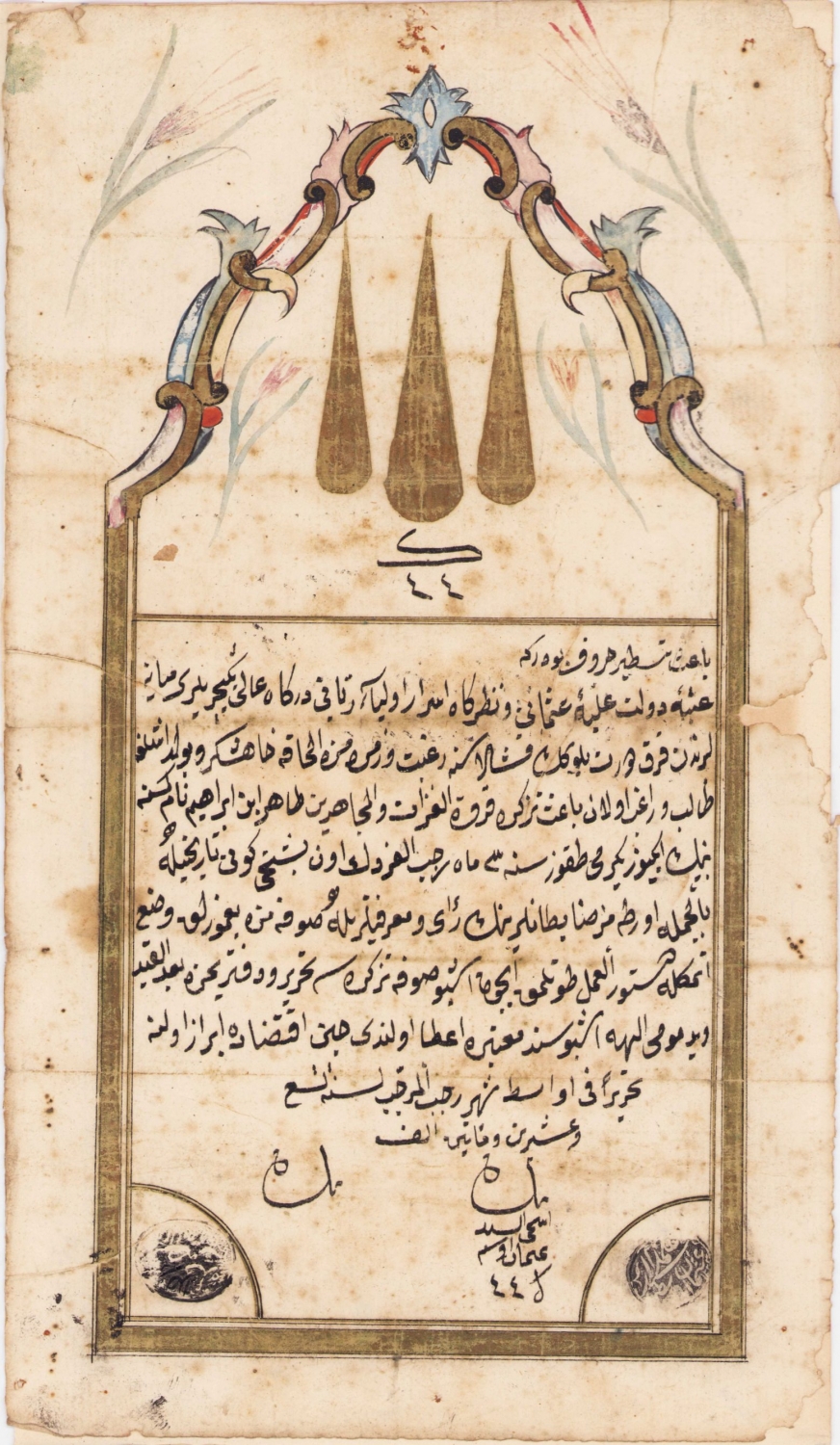 Yeniçeri Ocağına Es Seyyid Osman'ın 1229 yılında aşçı olarak kabul edilmesine dair altın tezhipli icazet, Osmanlı tarihi açısından çok nadir nitelikteki bu belgenin tam çevirisi aşağıdadır. 29x41 cm