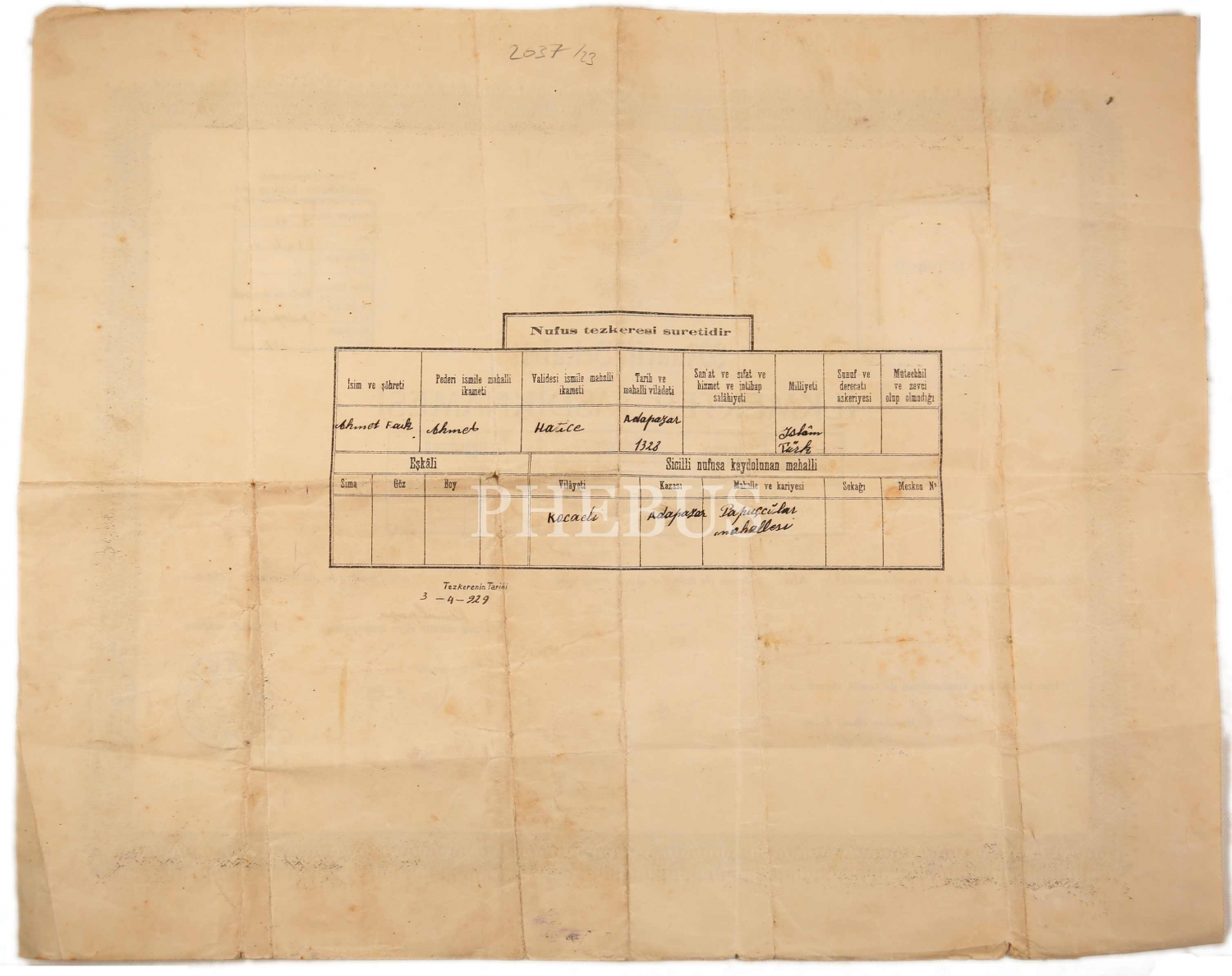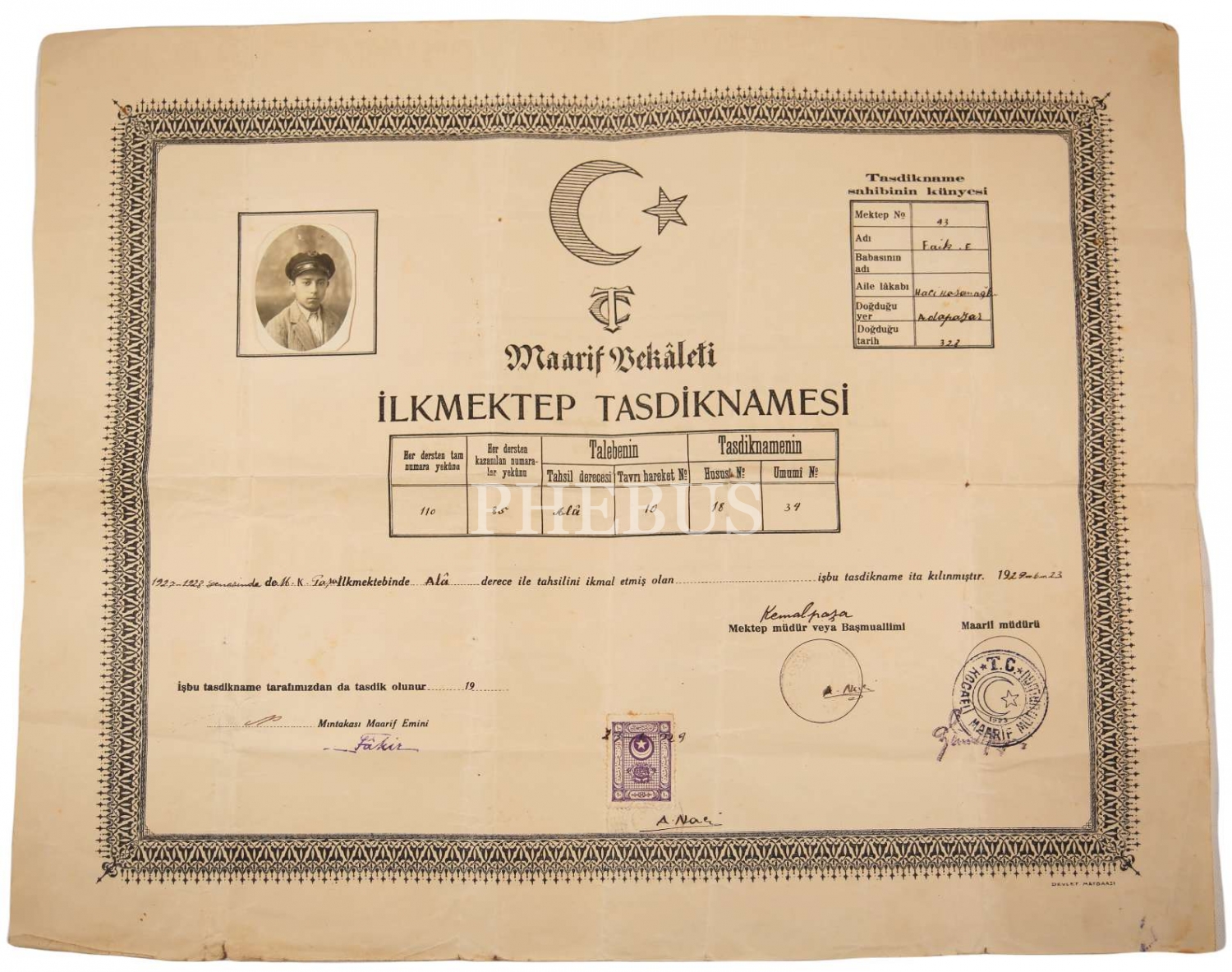 Fotoğraflı ilkokul tasdiknamesi, 1929 tarihli, 35x44 cm, kenarları yıpranmış haliyle