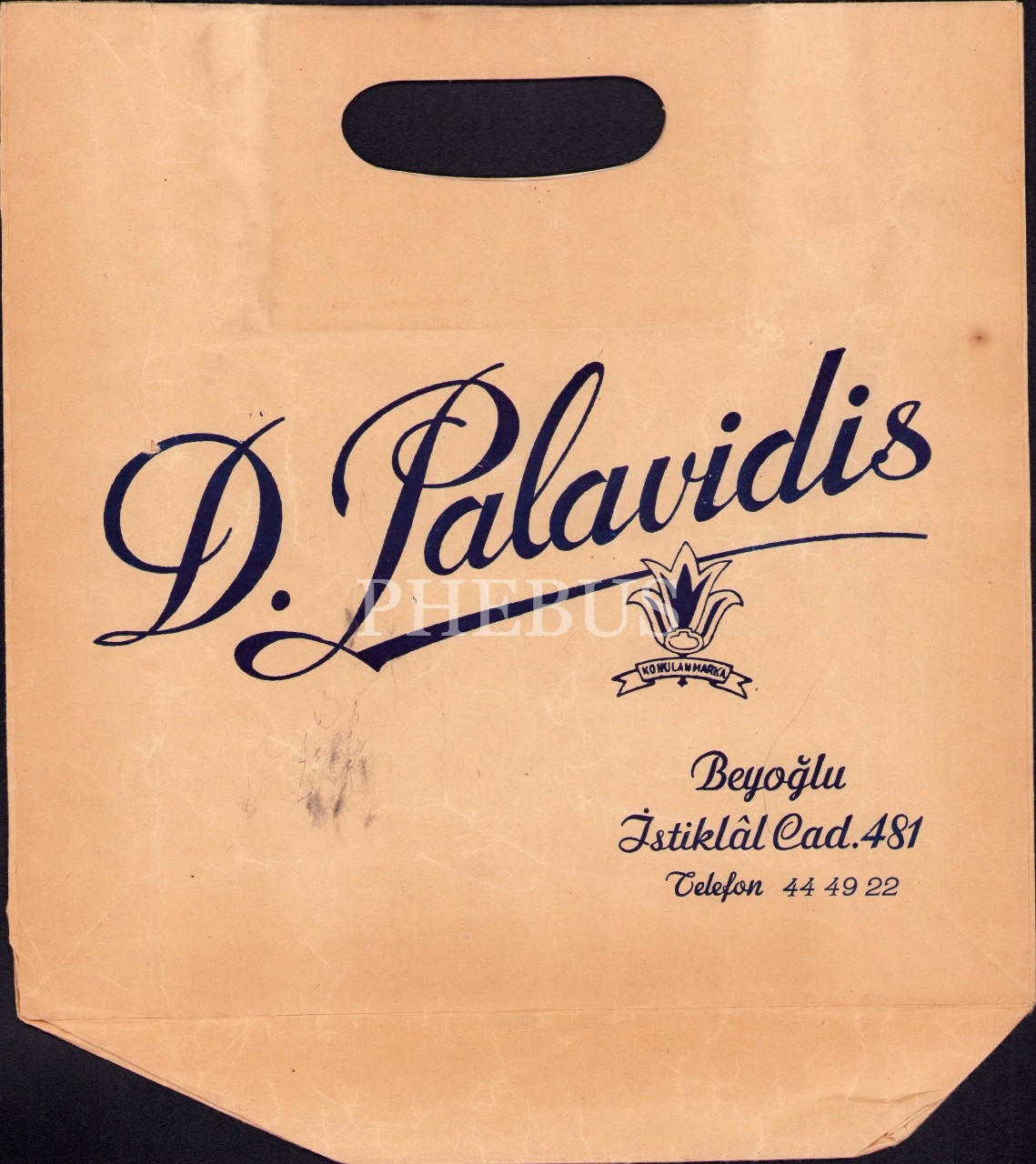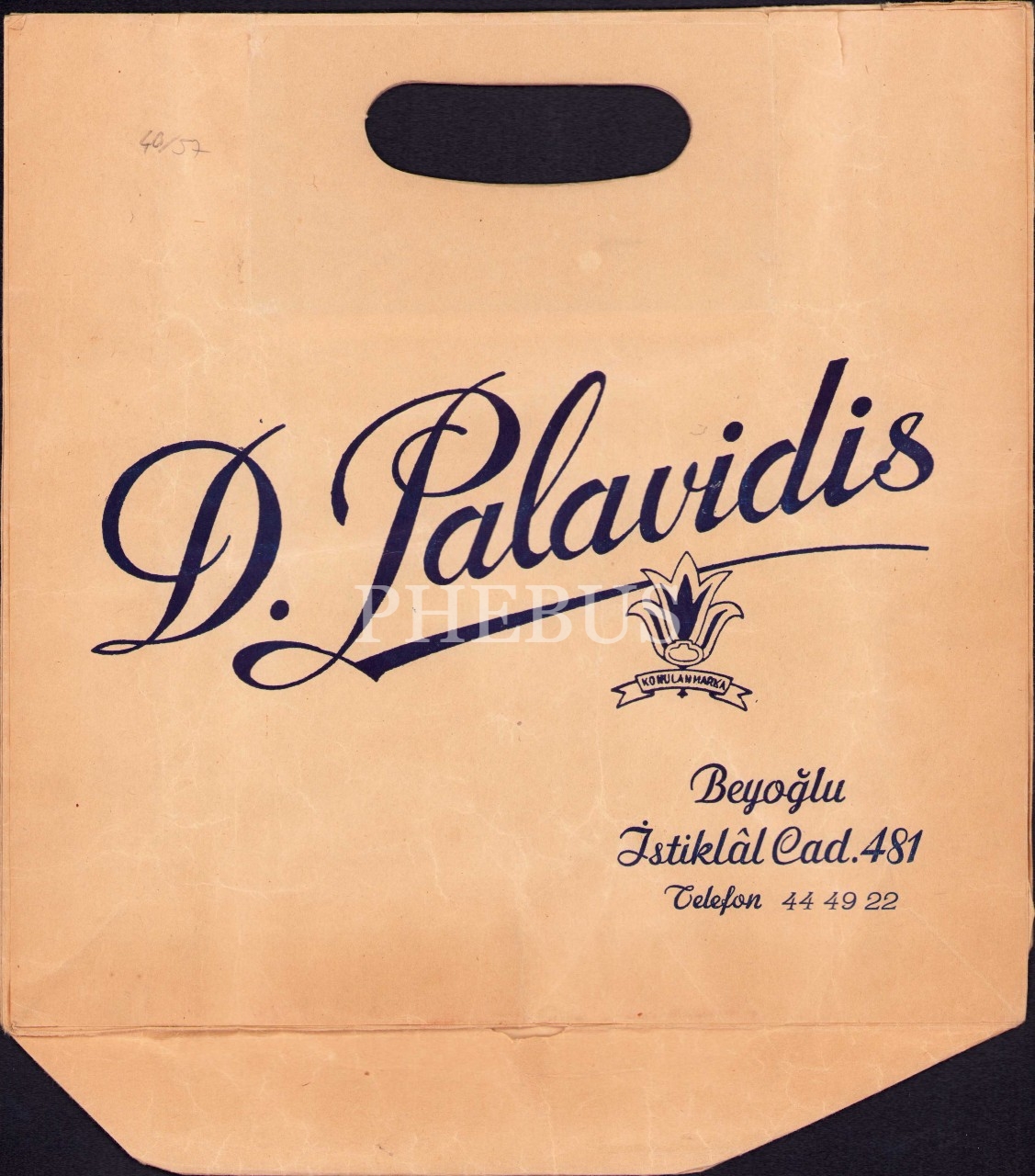 Önlü arkalı D. Palavidis-Beyoğlu İstiklâl Cad. yazılı kâğıt torba, 27x31 cm, yıpranmış haliyle