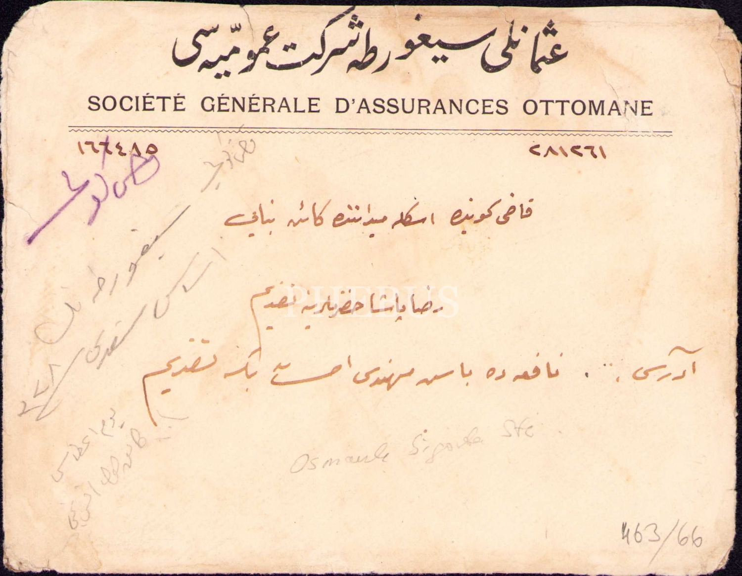 Osmanlı Sigorta Şirket-i Umûmiyesi antetli, üzeri Osmanlıca yazılı zarf, 13x17 cm, yıpranmış haliyle