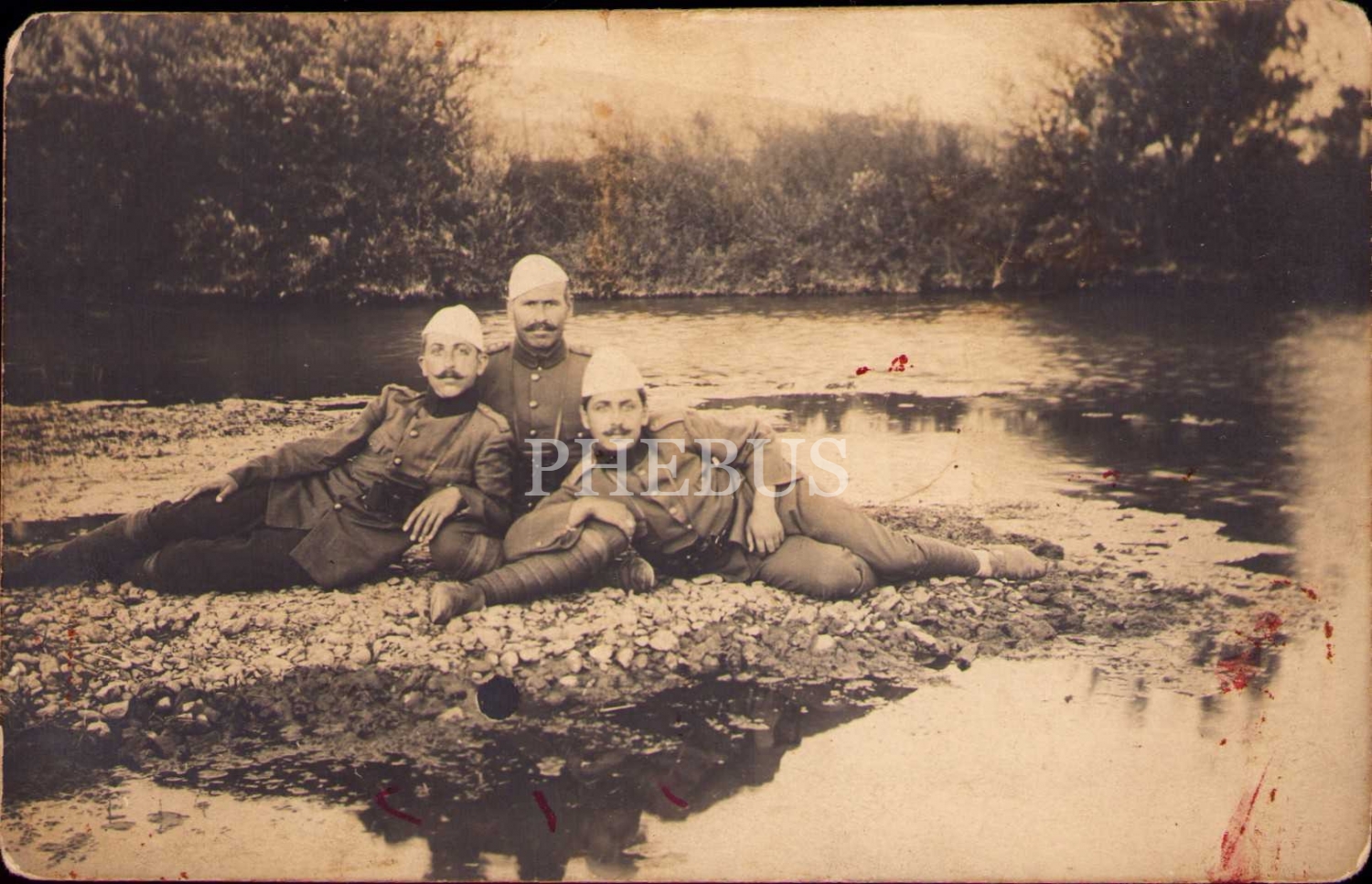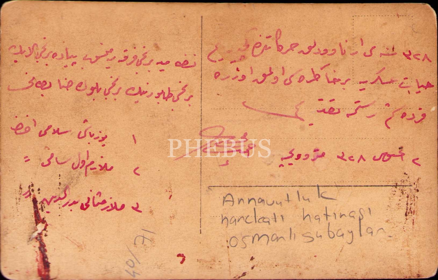 Arnavutluk Harekâtı'nda Osmanlı subayları hatıra fotoğrafı, 1328 tarihli, arkası Osmanlıca yazılı, yorgun haliyle
