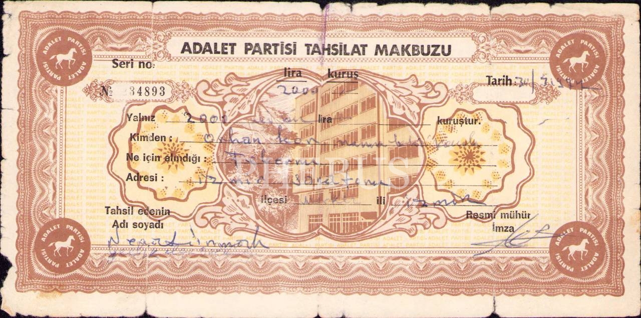 Adalet Partisi Tahsilat Makbuzu, 197?, 10x21 cm, yıpranmış haliyle