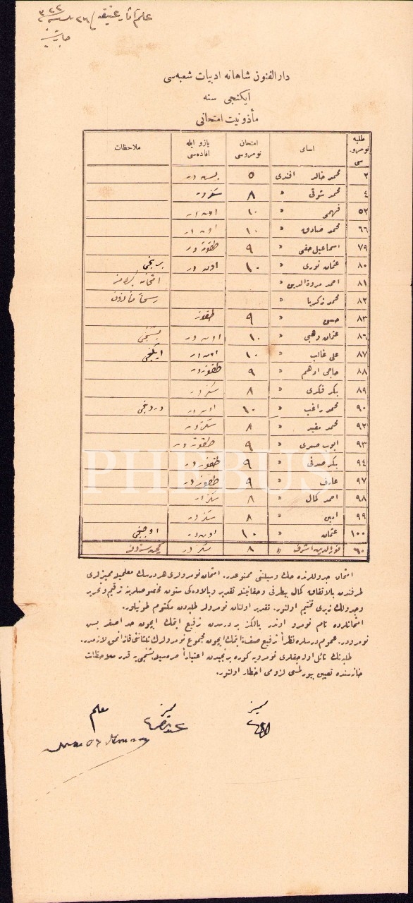 Osmanlıca Darülfünun Edebiyat Bölümü sınav sonuçları, 1322 tarihli, 17x50 cm