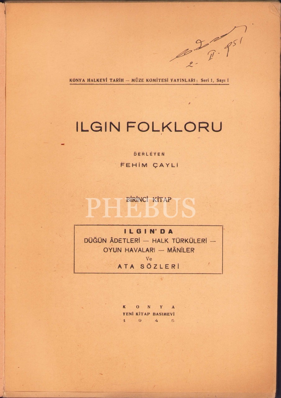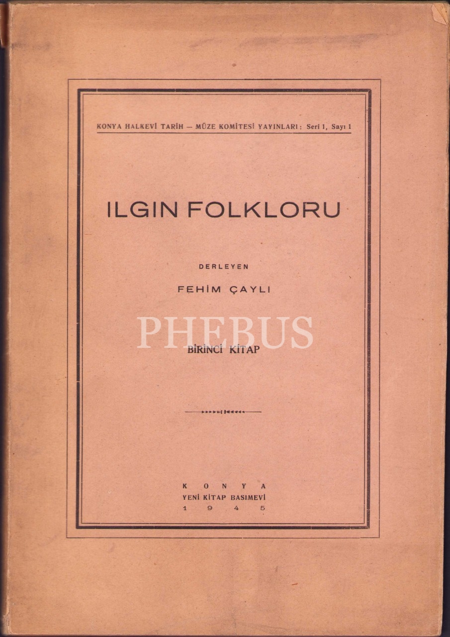 Ilgın Folkloru, derl. Fehim Çaylı, Yeni Kitap Basımevi, Konya 1945, 220 s., 20x29 cm, kapağı yıpranmış haliyle