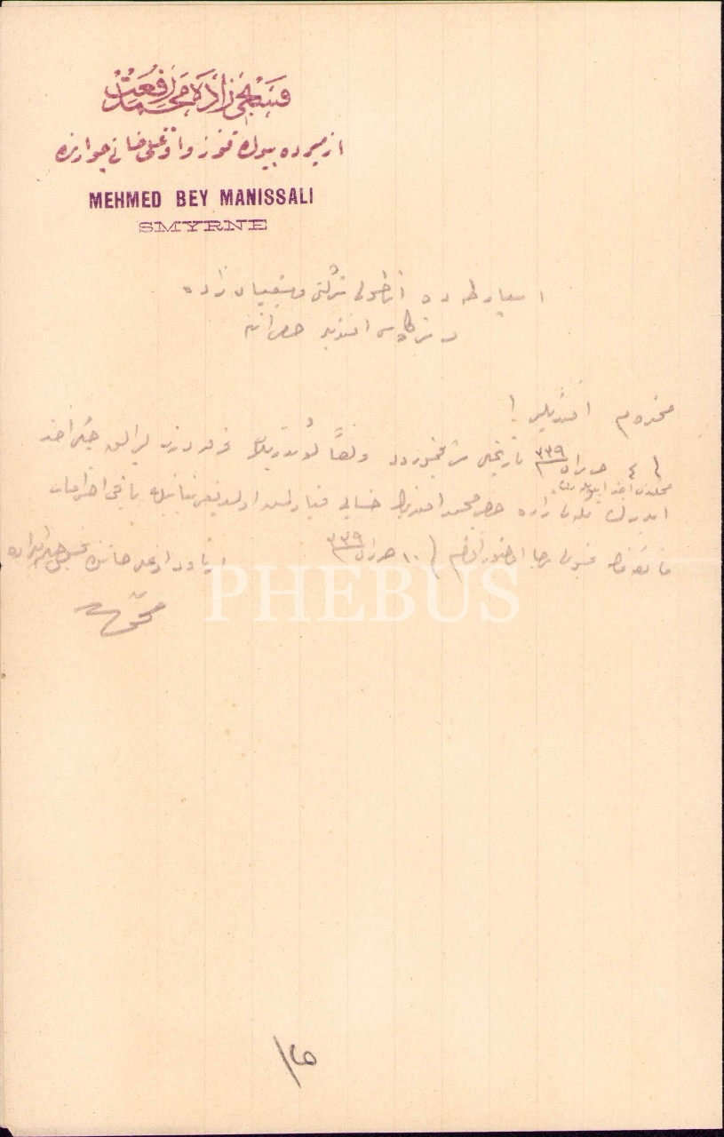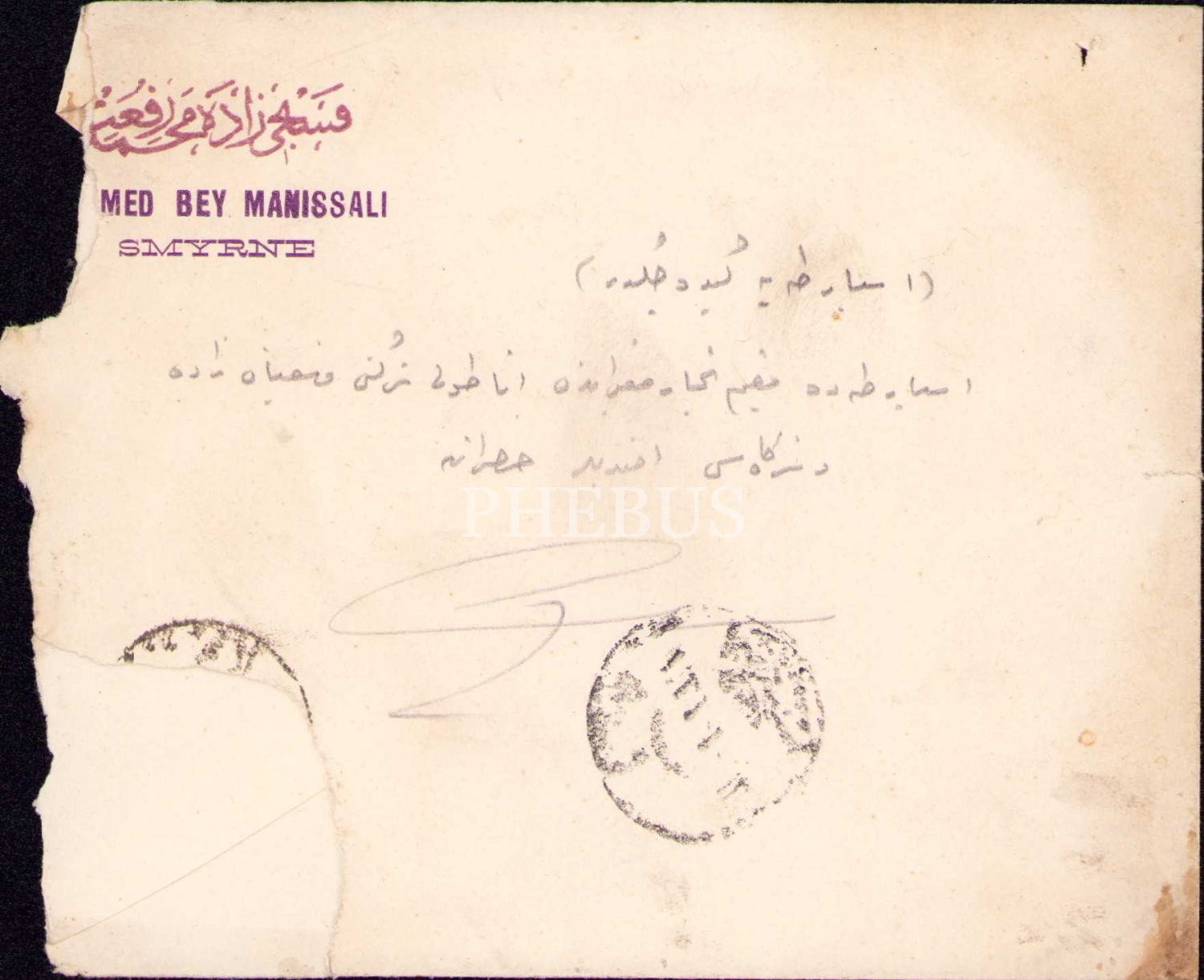 Osmanlıca Fescizâde Mehmed Rifat-Smyrne antetli kâğıt ve zarfta alışveriş bilgi mektubu, Isparta alıcılı ve 1339 tarihli, 14x21 cm, zarfı yıpranmış haliyle