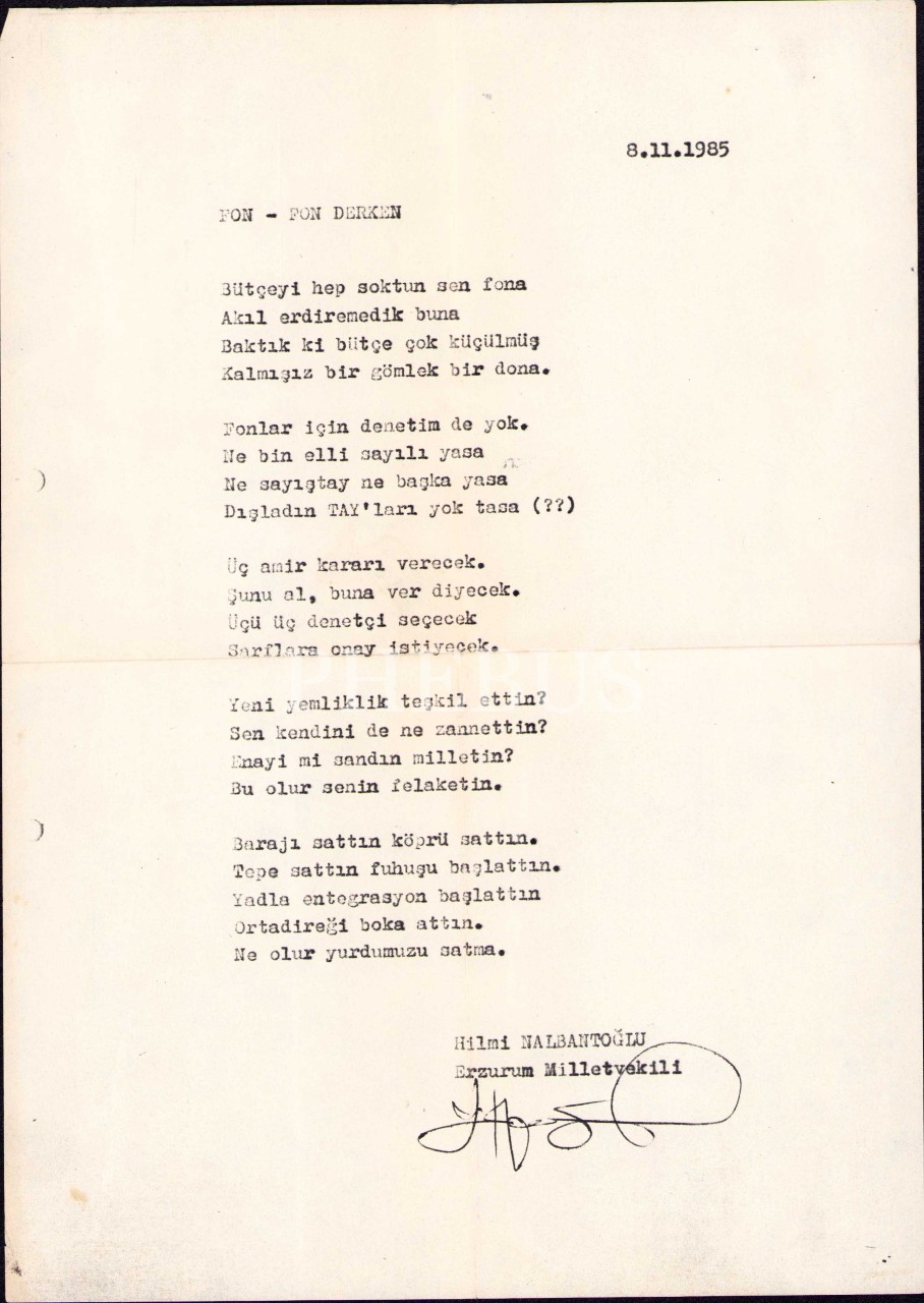 Erzurum Milletvekili Hilmi Nalbantoğlu imzalı şiir: "Fon-Fon Derken", 1985 tarihli, 21x29 cm, yıpranmış haliyle