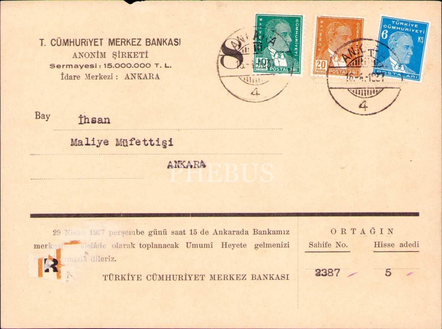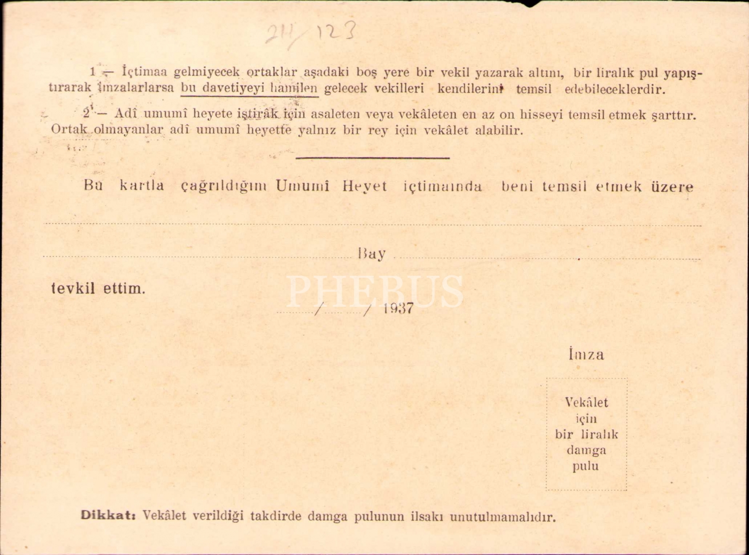 T. Cümhuriyet Merkez Bankası Anonim Şirketi antetli davetiye, 1937 tarihli, 13x17 cm