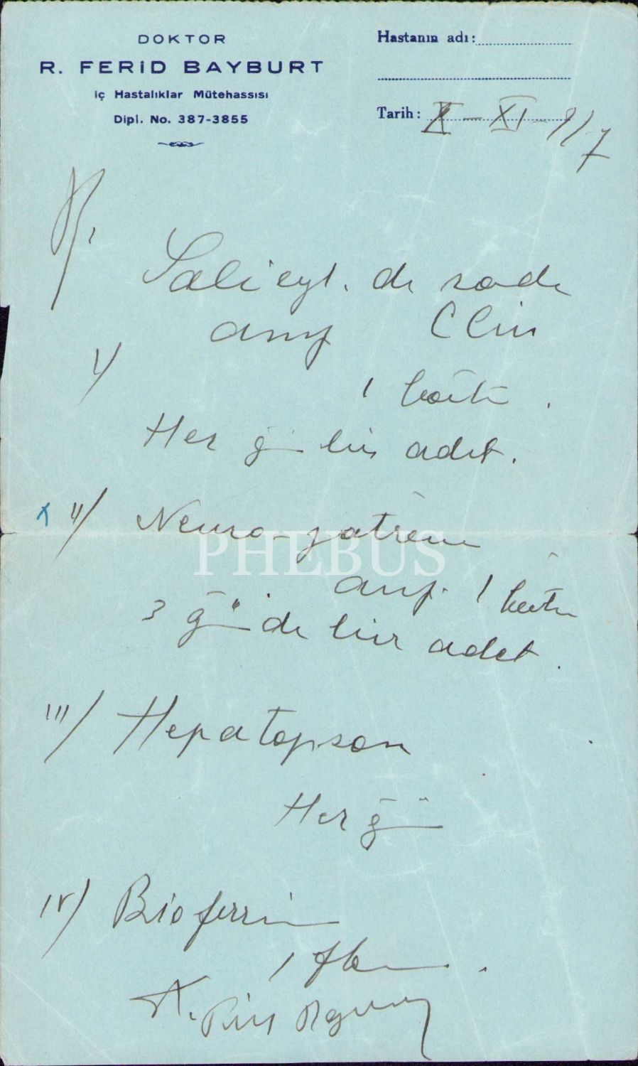 Doktor R. Ferid Bayburt antetli reçete, 12x19 cm