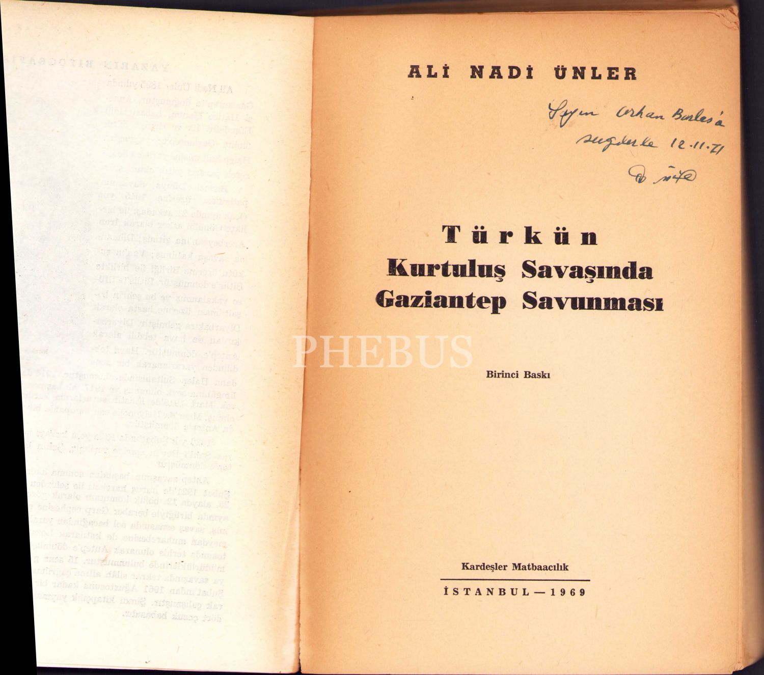 Türkün Kurtuluş Savaşında Gaziantep Savunması, Ali Nadi Ünler, ithaflı ve imzalı, Kardeş Matbaacılık, İstanbul 1969, 304 s., 16x24 cm, cildi yorgun haliyle