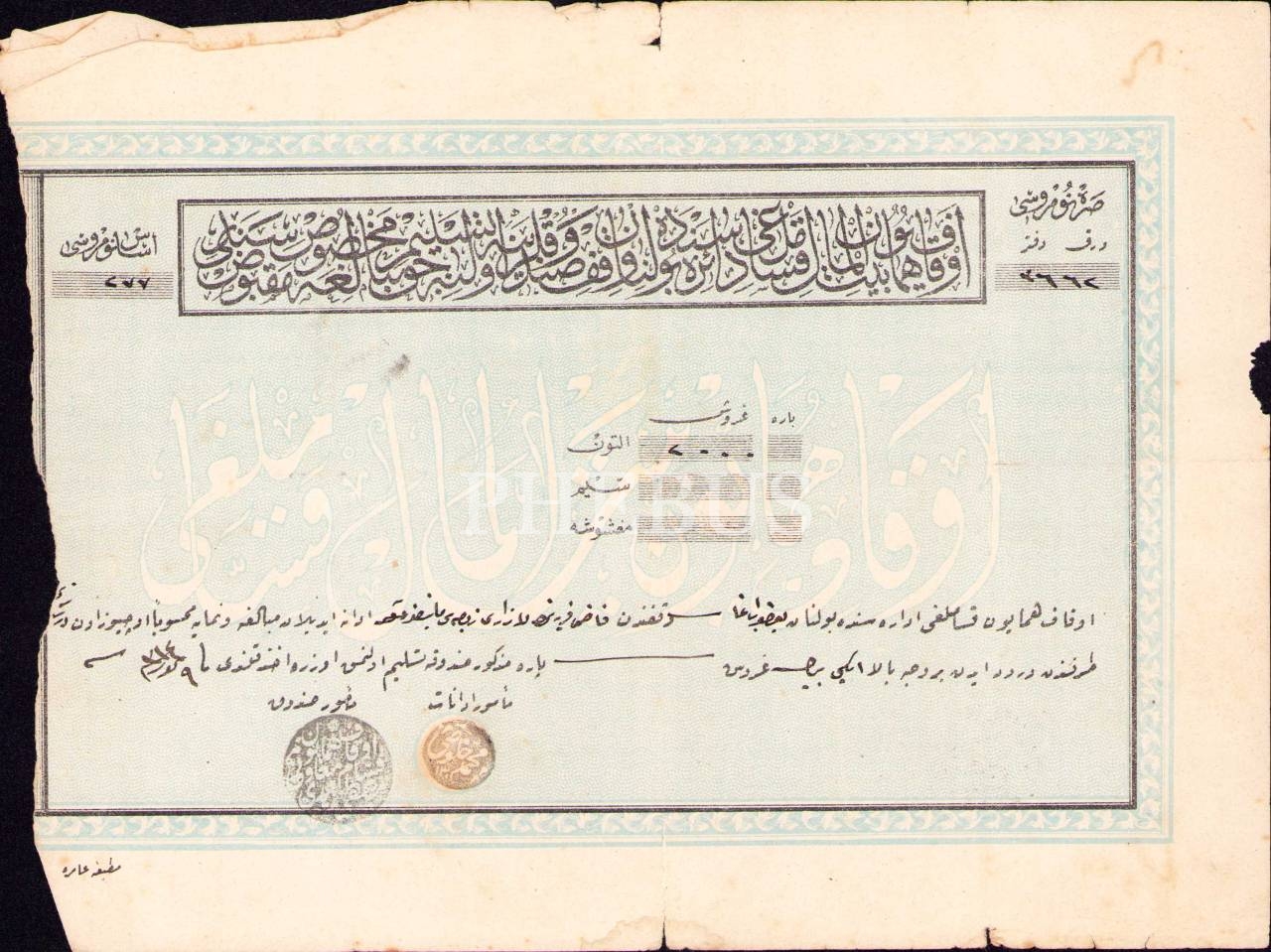 Osmanlıca Evkâf-ı Hümayun Beytülmal Kassamlığı antetli makbuzu, 1314 tarihli, 19x25 cm, kenarları yıpranmış haliyle