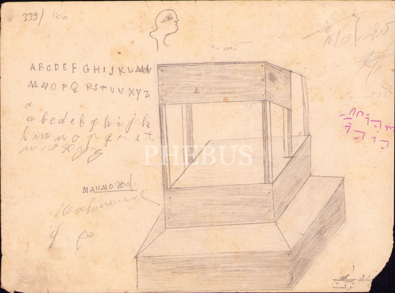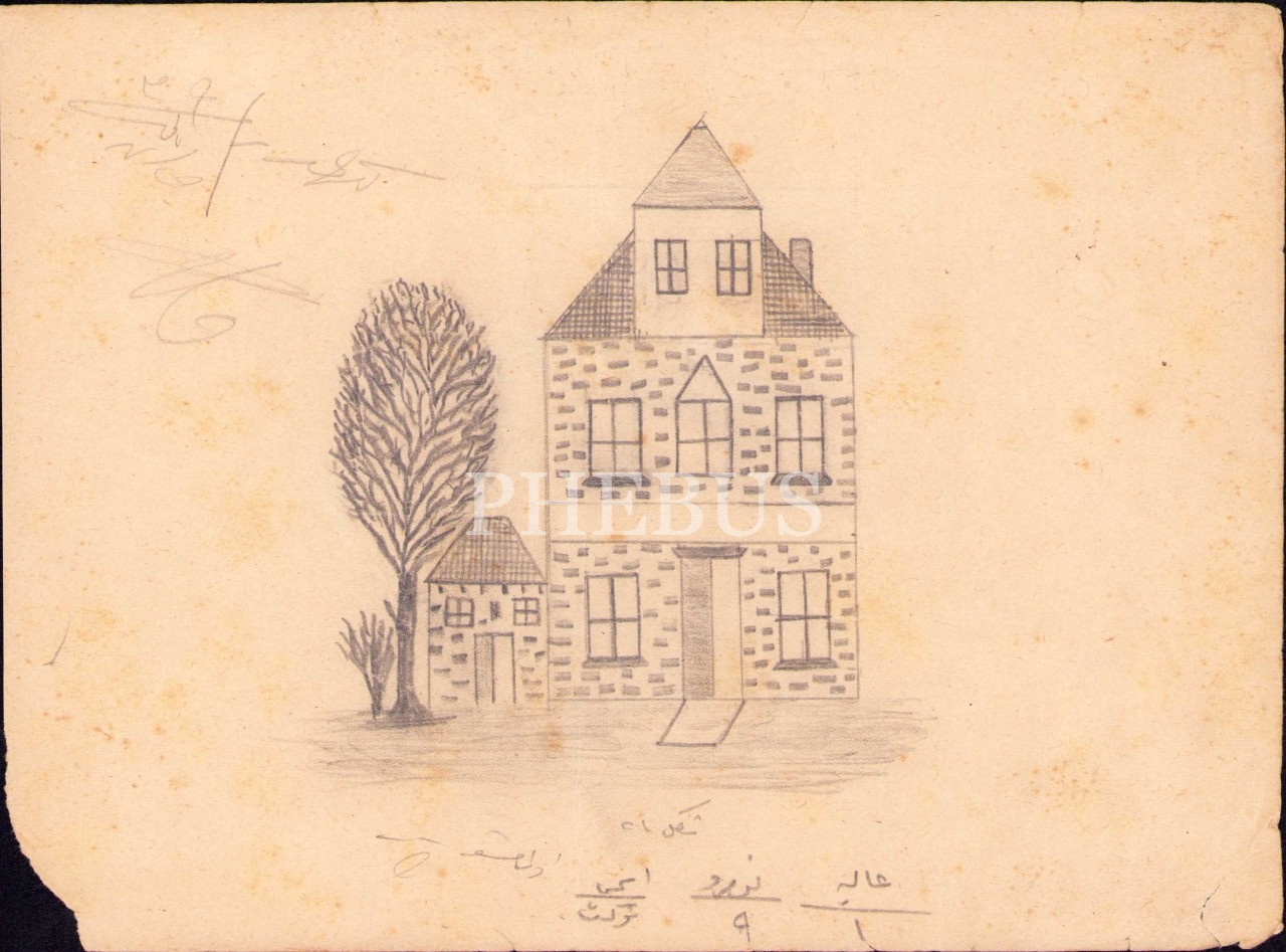 Şevket Bey imzalı, hoca tarafından “Görülmüştür” şeklinde onay notu düşülmüş, arkalı önlü karakalem çizimi, 18x25 cm, iki köşesi yırtık ve yıpranmış haliyle