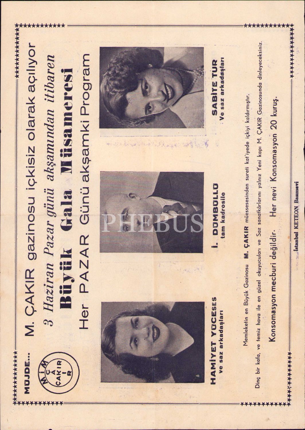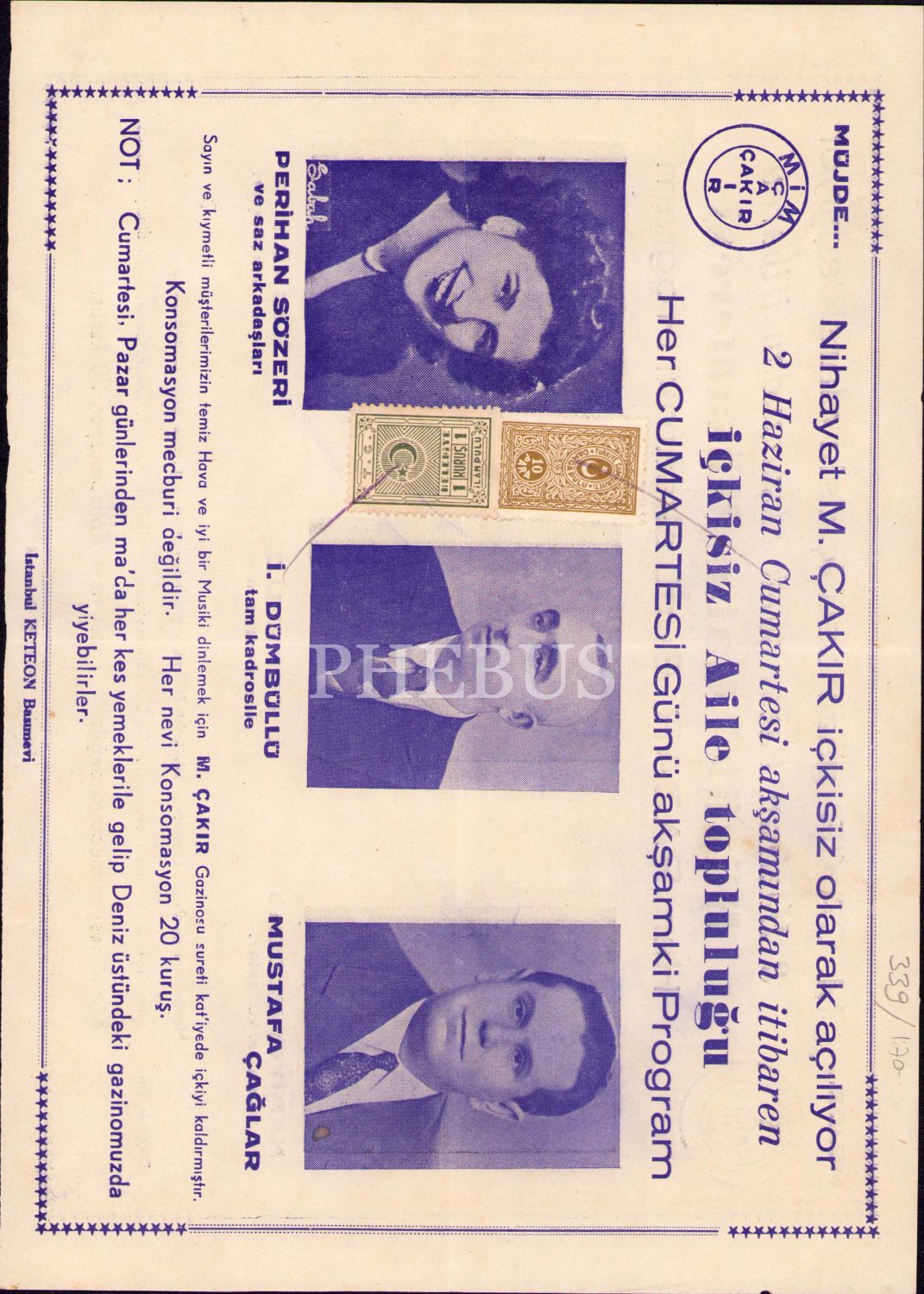 Mim Çakır Gazinosu'nun içkisiz olarak açılışına dair ilan, Hamiyet Yüceses, İsmail Dümbüllü ve Sabite Tur Gülerman, ilan ve damga pullu, 20x28 cm