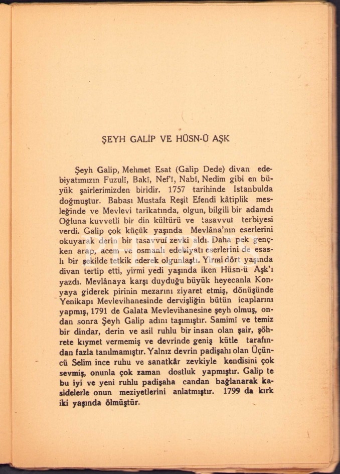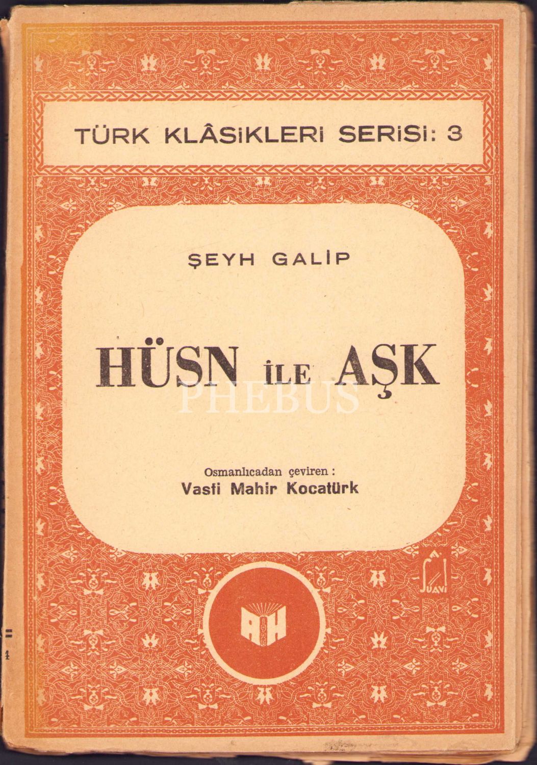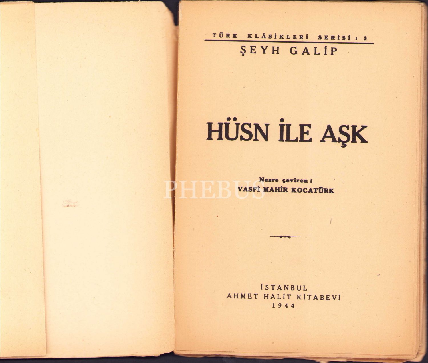 Hüsn ile Aşk, Şeyh Galip, çev. Vasfi Mahir Kocatürk, Ahmet Halit Kitabevi, İstanbul 1944, 91 s., 14x21 cm, yıpranmış haliyle