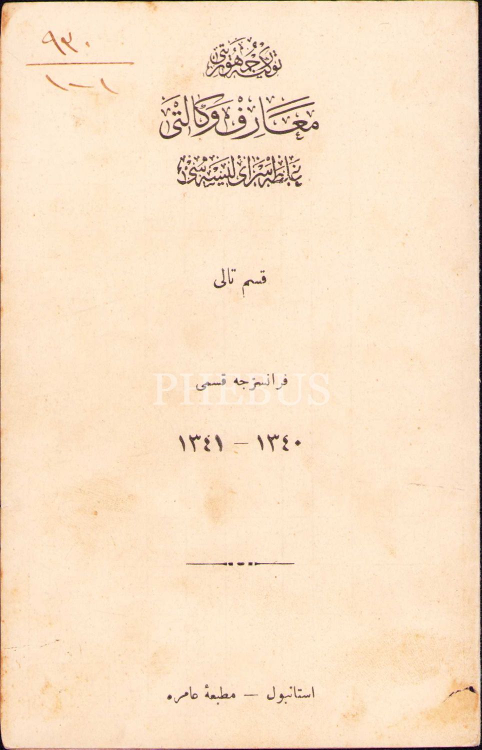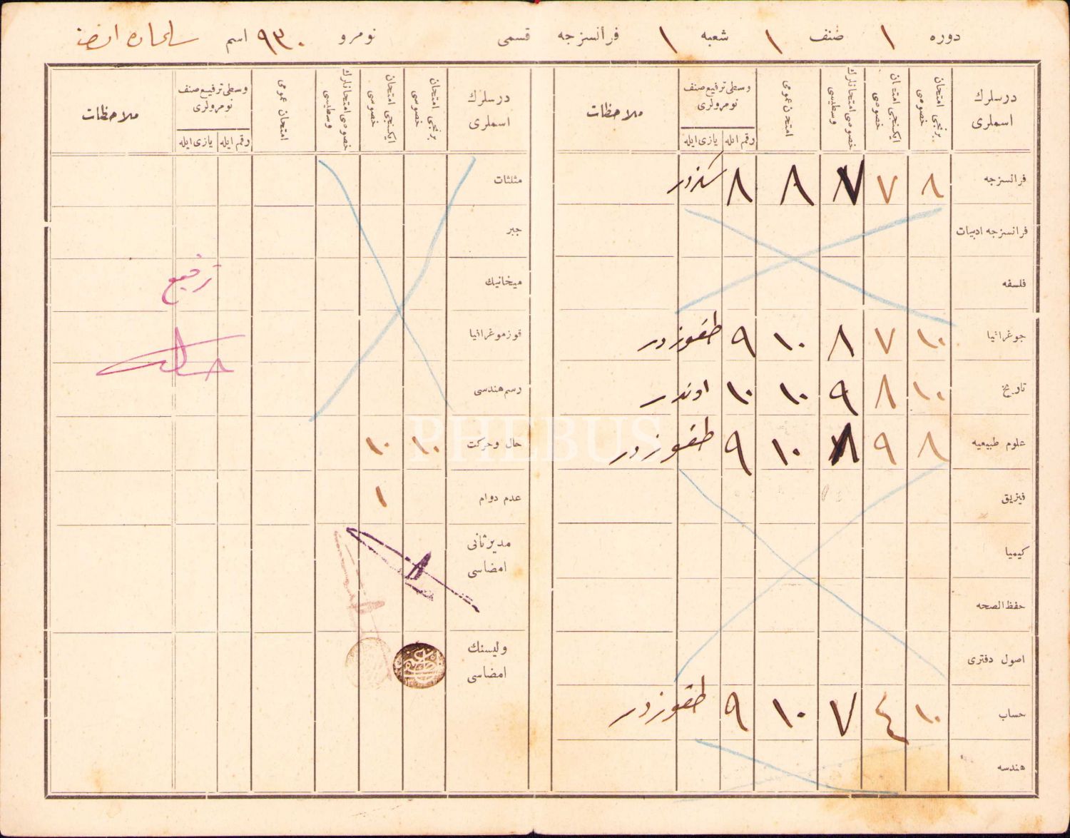 Osmanlıca Galatasaray Lisesi öğrenci karnesi, 1340-41 eğitim-öğretim yılı, 12x18 cm