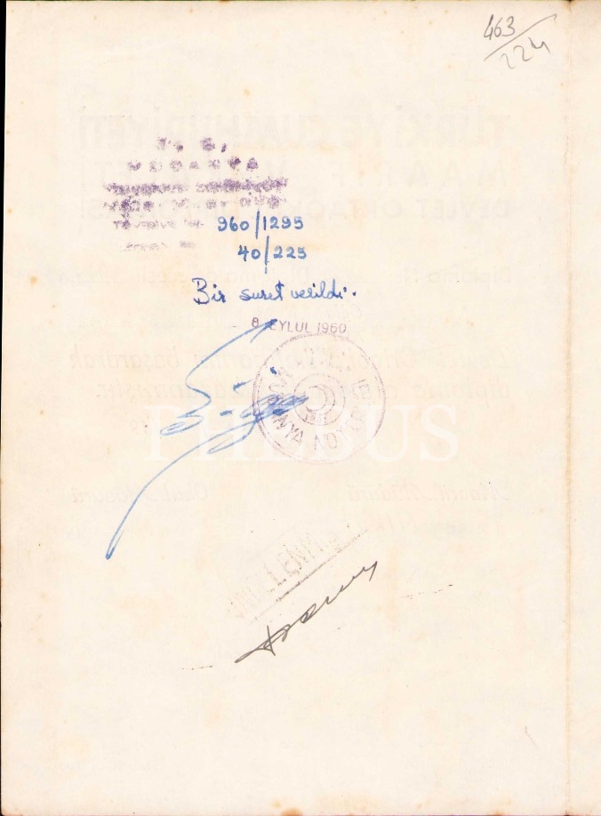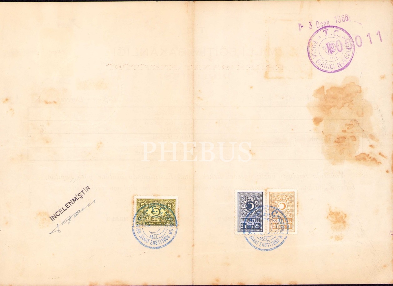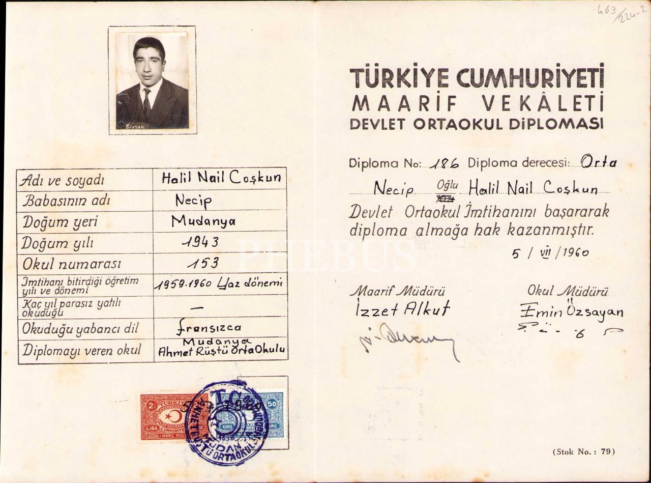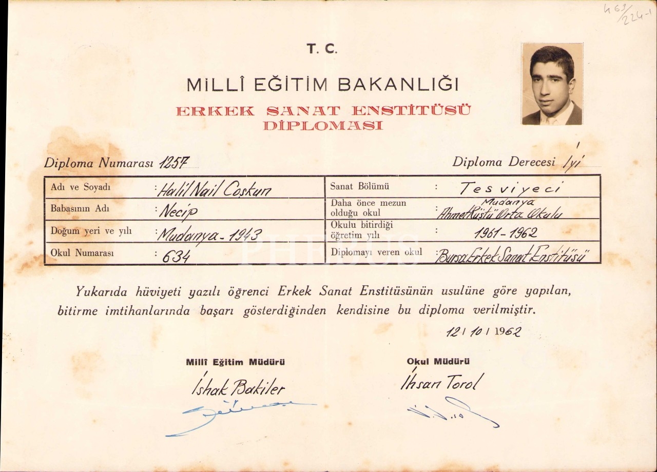 Halil Nail Coşkun'a ait fotoğraflı ortaokul ve erkek sanat enstitüsü diplomaları, 1960 ve 1962 tarihli, 21x29 cm, yorgun haliyle