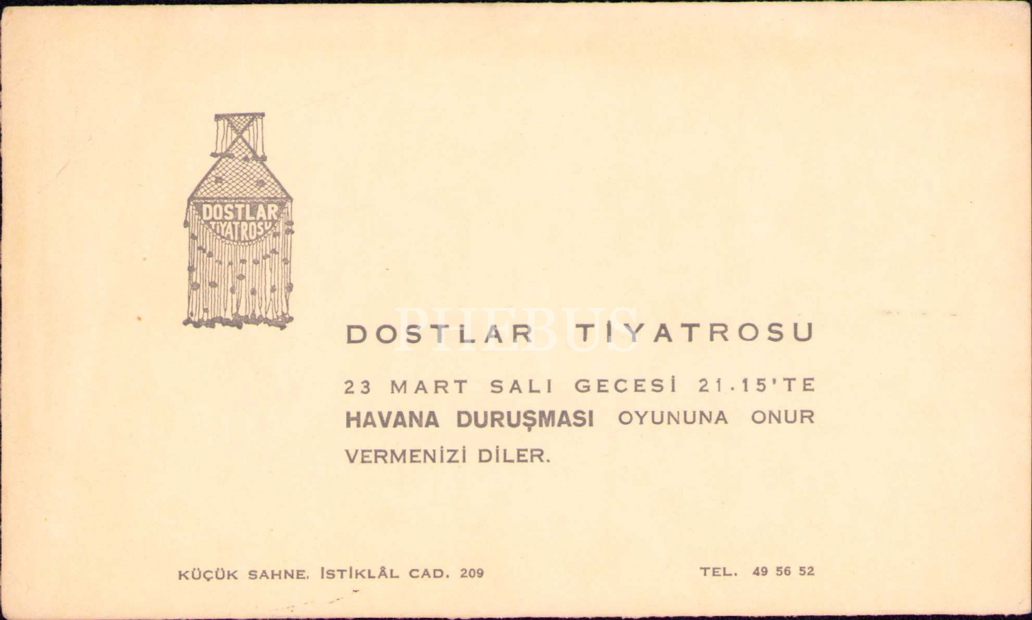 Dostlar Tiyatrosu davetiyesi, 10x17 cm, bir köşesi kırık