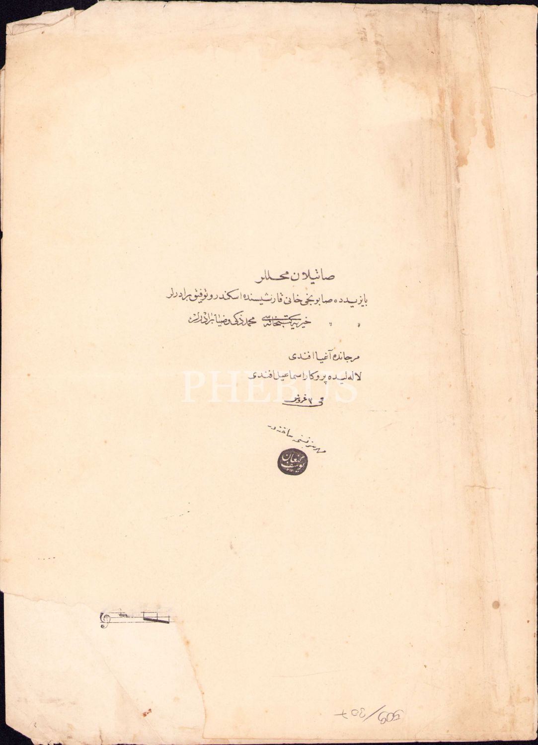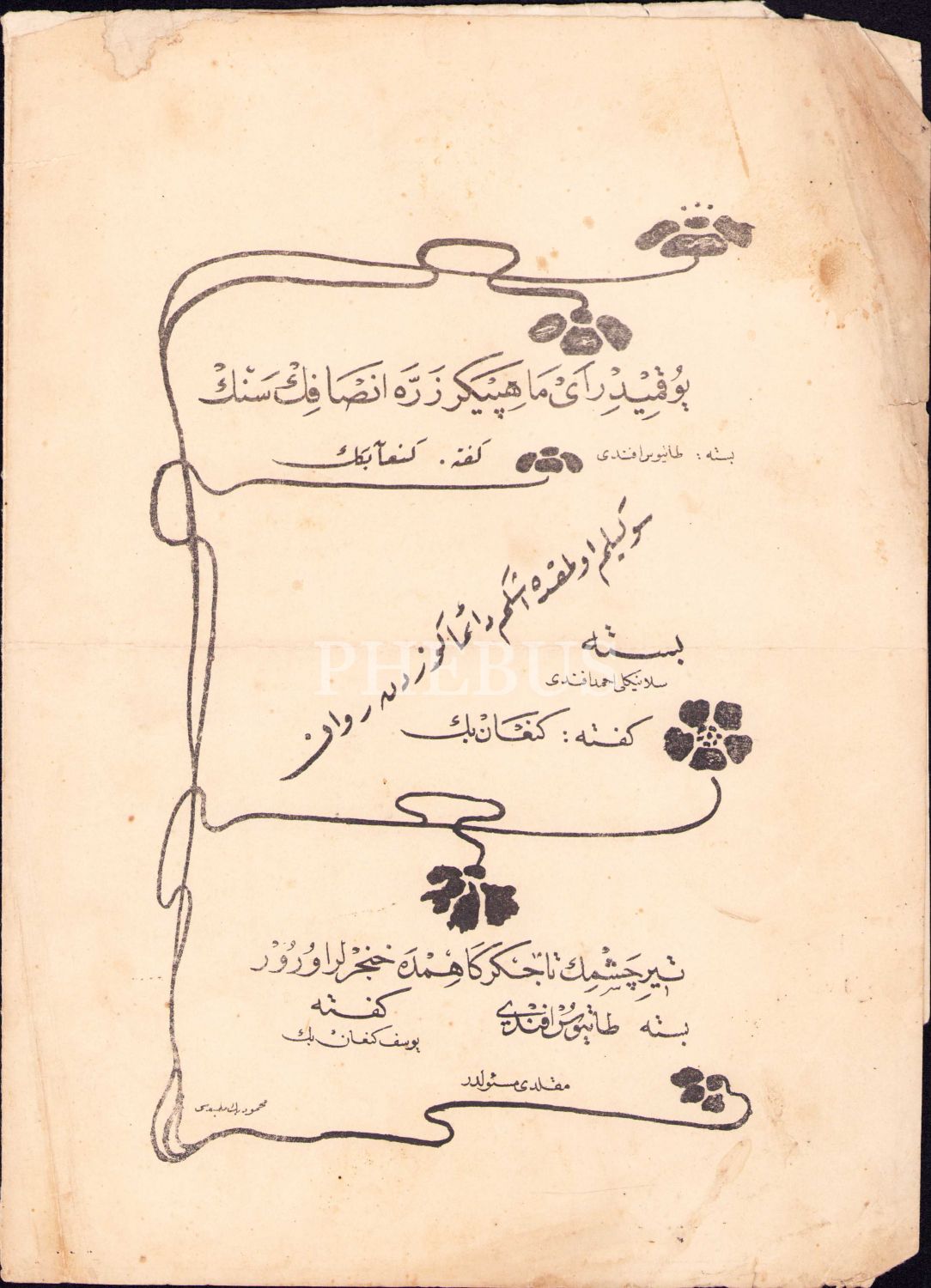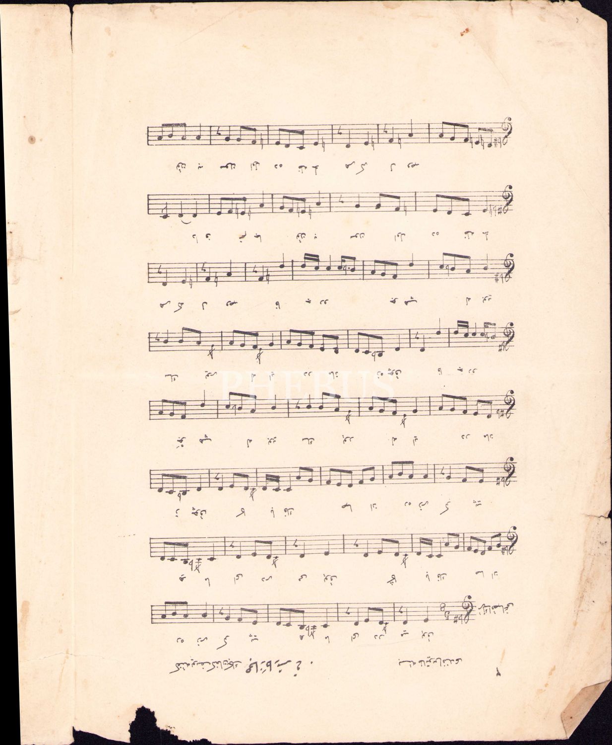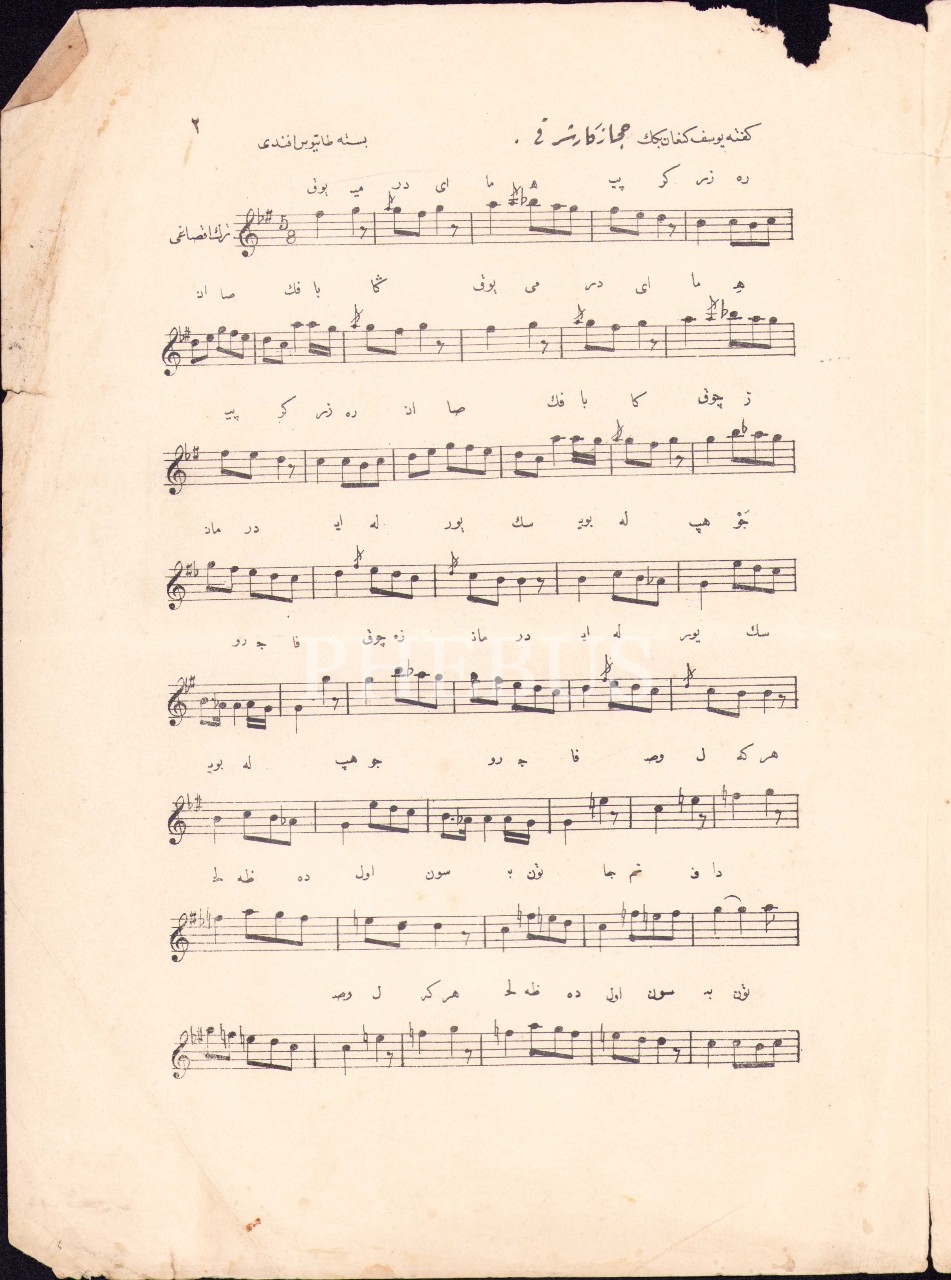 Tatyos Efendi'ye ait Osmanlıca nota, güfte: Kenan Bey, 25x34 cm, bir köşesi yırtık ve yıpranmış haliyle